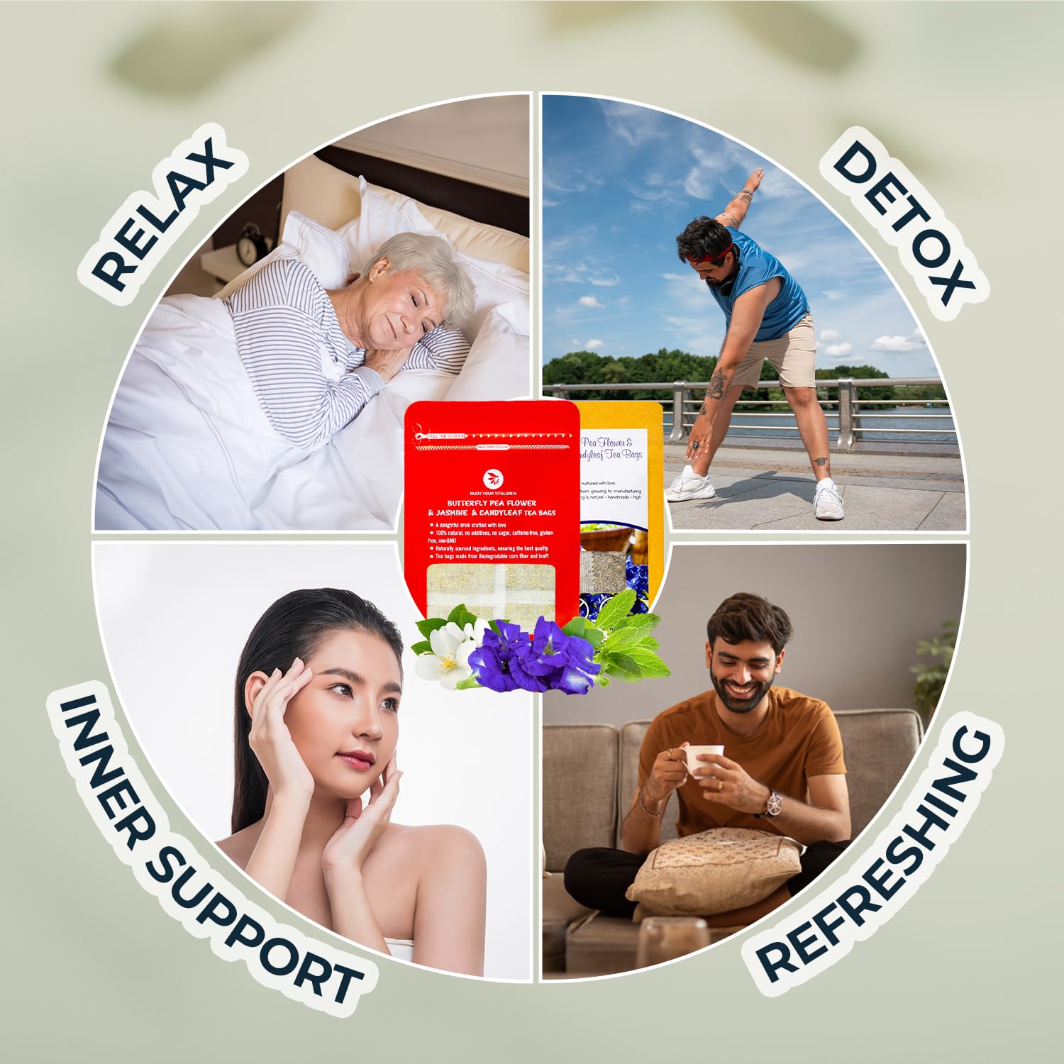 - š[NEW TEA SAMPLERS] The 10 tea bags version is ready for newbies. Enjoy the vibrant taste of butterfly pea flower mixed with jasmine's soothing aroma and stevia's natural sweetness. This tea offers a refreshing and calming experience in every cup.