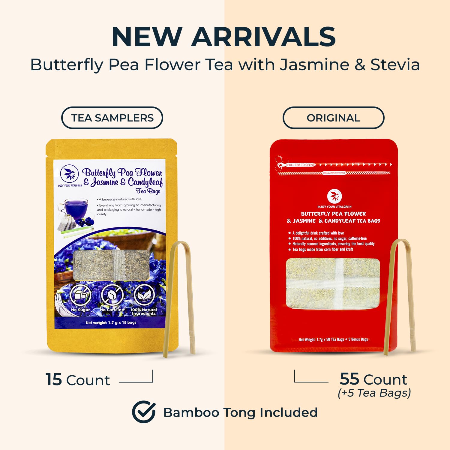 Butterfly Pea Flower Tea Samplers with Jasmine & Stevia - 15 Count, Mini Tea Bags, Bamboo Tong Included, No Sugar Added, Re-Steep Natural Herbal Tea Blend for Skin,Support