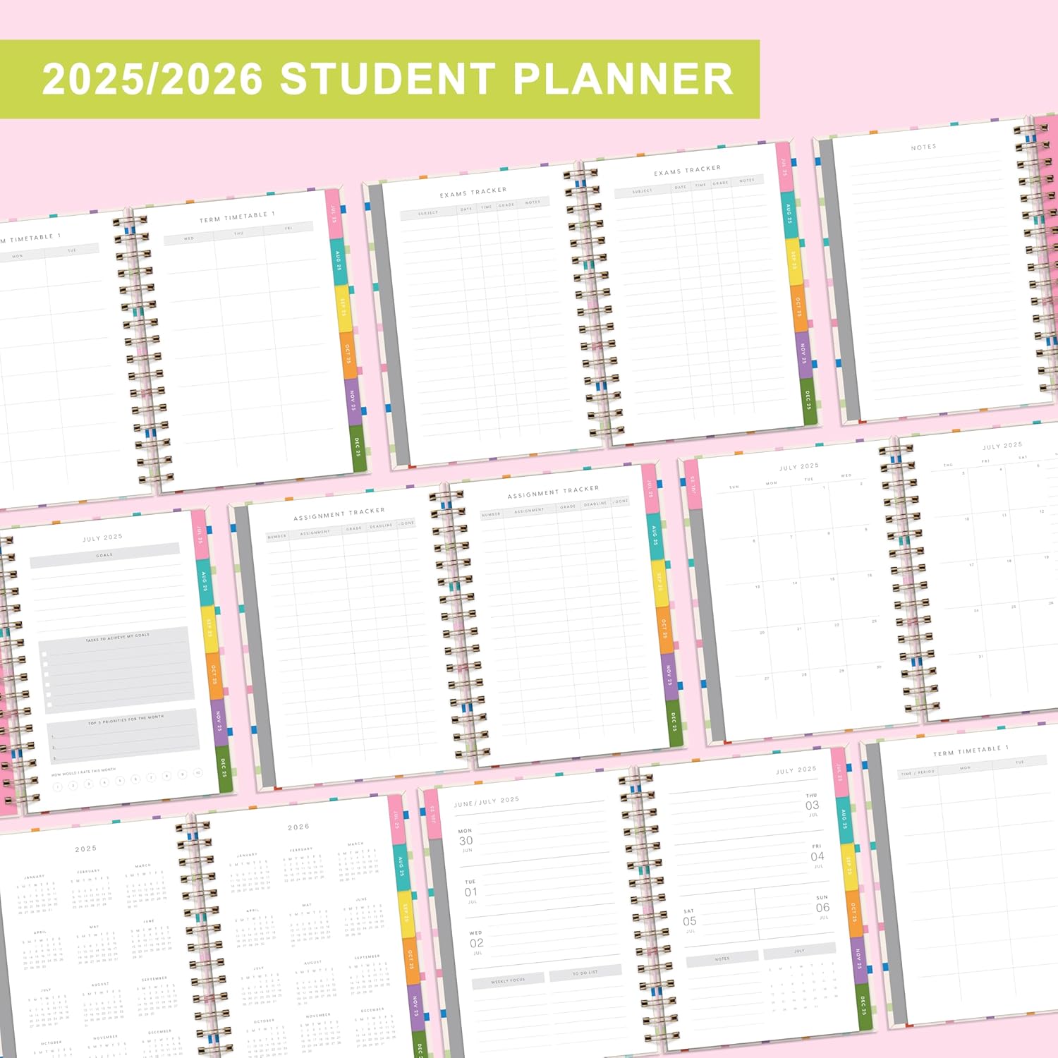 - Functional Designs: Student Planner 2025-2026 Calendar Reference | Term Timetable | Assignment Tracker | Exams Tracker | Monthly Scheduling | Week's Goals | Notes Section | Planning Stickers | Printed 12 Colorful Monthly Tabs | Inner Pocket | Durable Twin-Wire Binding | Stylish Design
