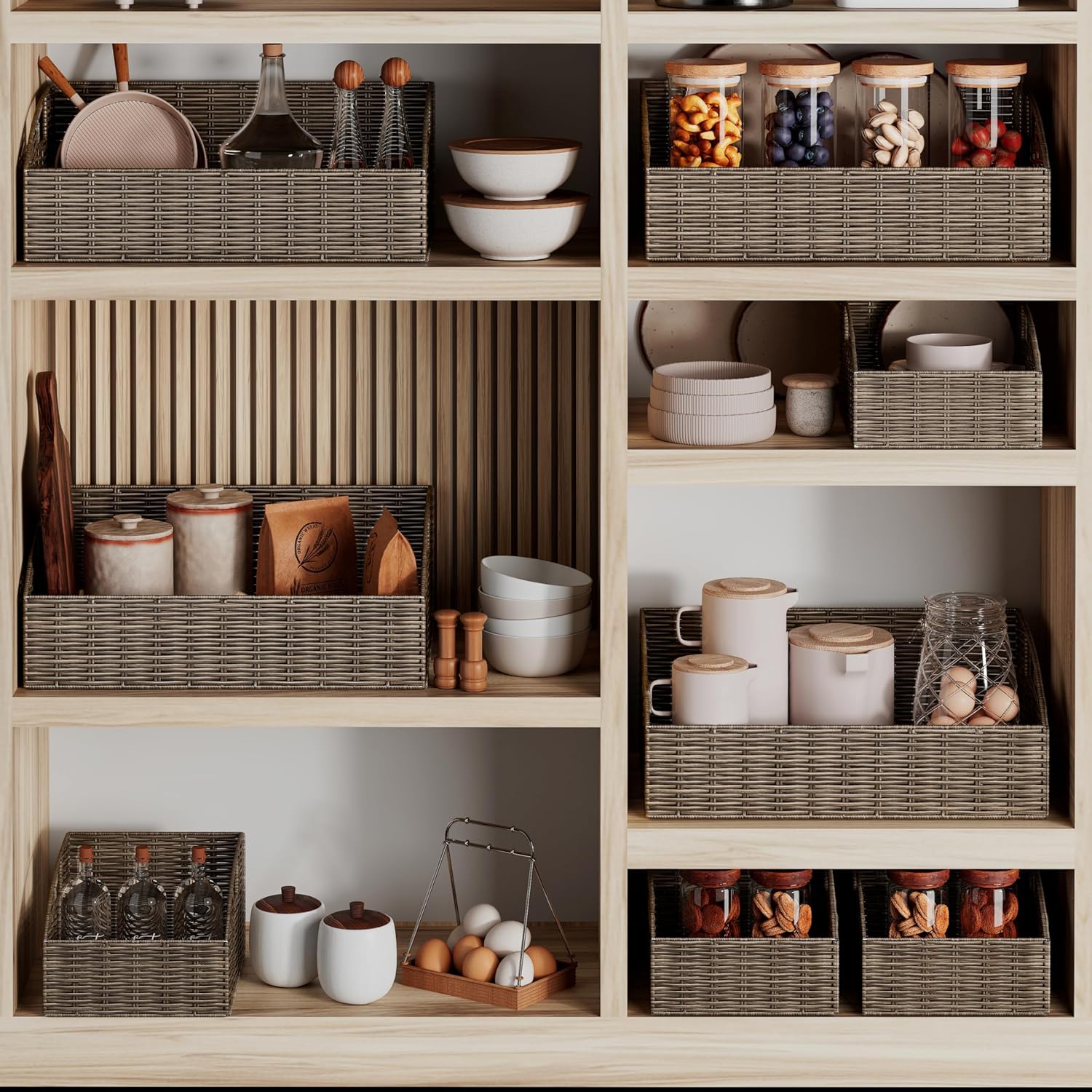 - GREAT VERSATILITY: Versatile pantry baskets provide you with a simple yet elegant way to neatly store and organize spices, vegetables, canned foods, bottles, magazines, clothes, scarves, gloves, laundry, kids' toys or other household items.