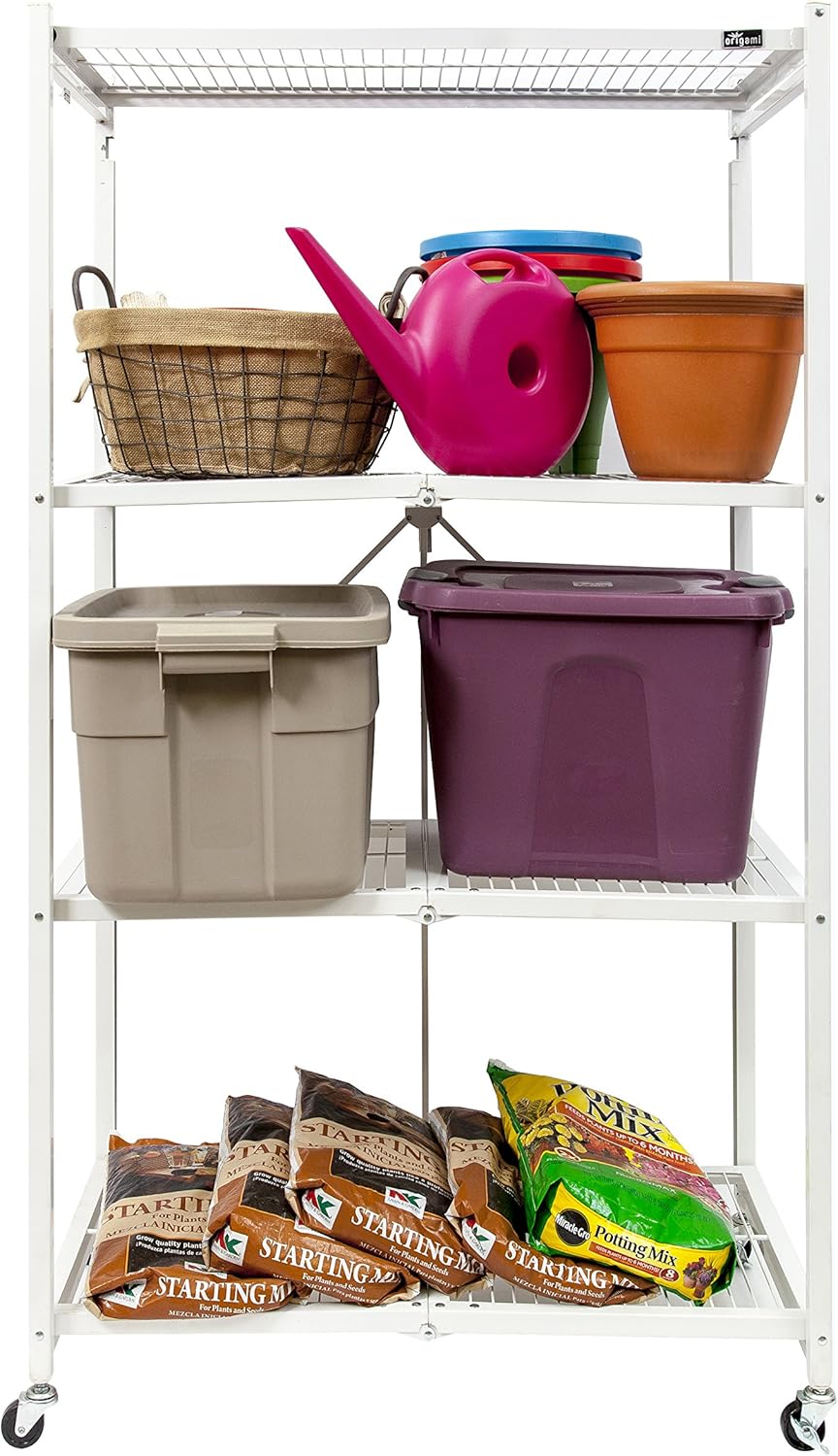 - Thoughtfully Designed 4-Tiered Storage: Innovative Origami foldable shelving racks made of commercial grade powder-coated steel provides a heavy duty multi-functional solution perfect for all your storage needs