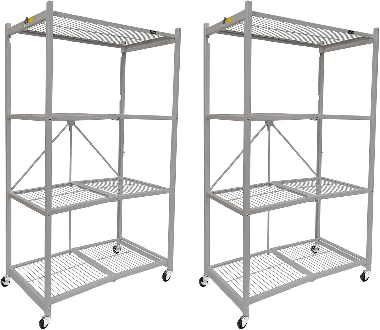 Origami 2 Pack 4 Tier Foldable Metal Garage Storage Shelf Rack, Wheels & Powder Coated Steel, Silver