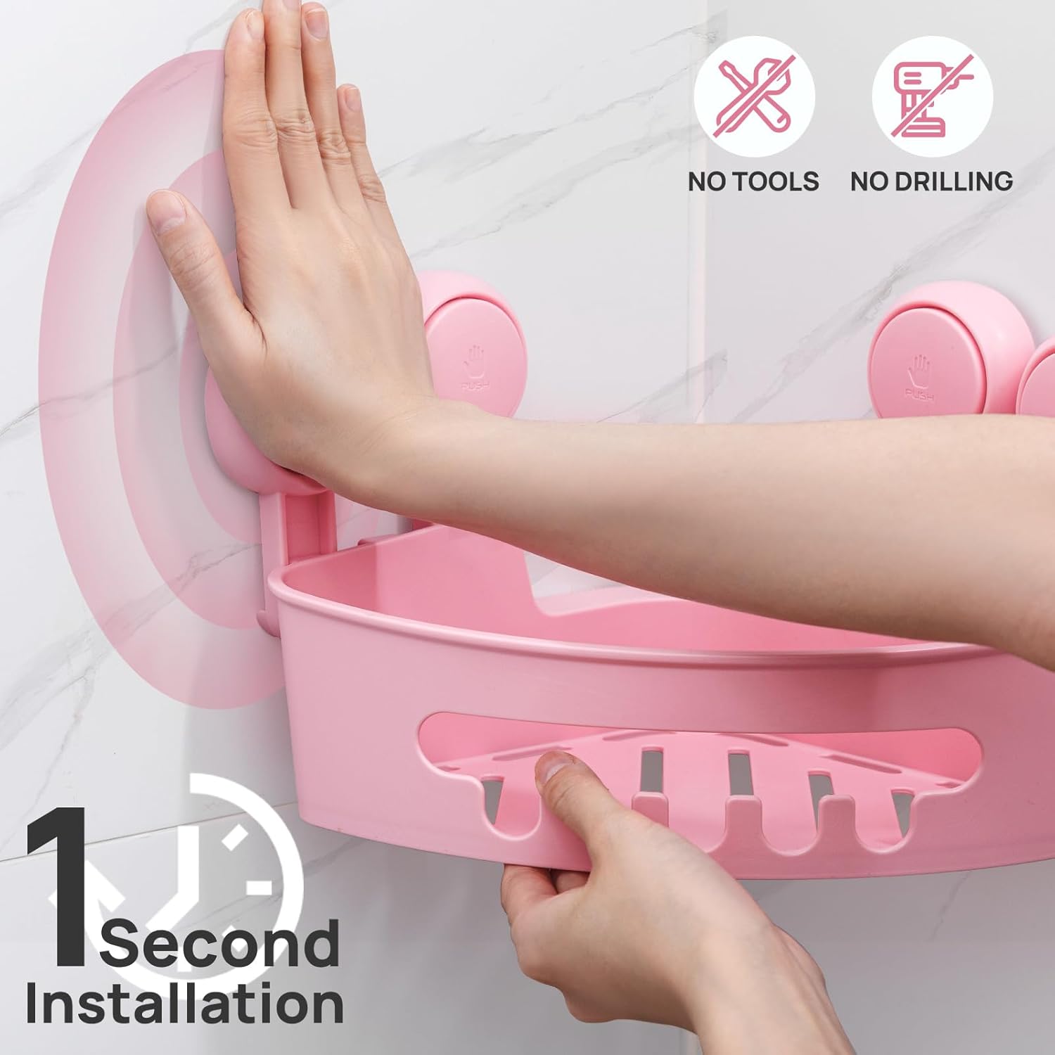 LEVERLOC Corner Shower Caddy Suction Cup, Shower Caddy Basket Powerful Suction Bathroom, Waterproof & Rustproof Organizer for Bathroom Storage, No-Drilling Removable (Pink)