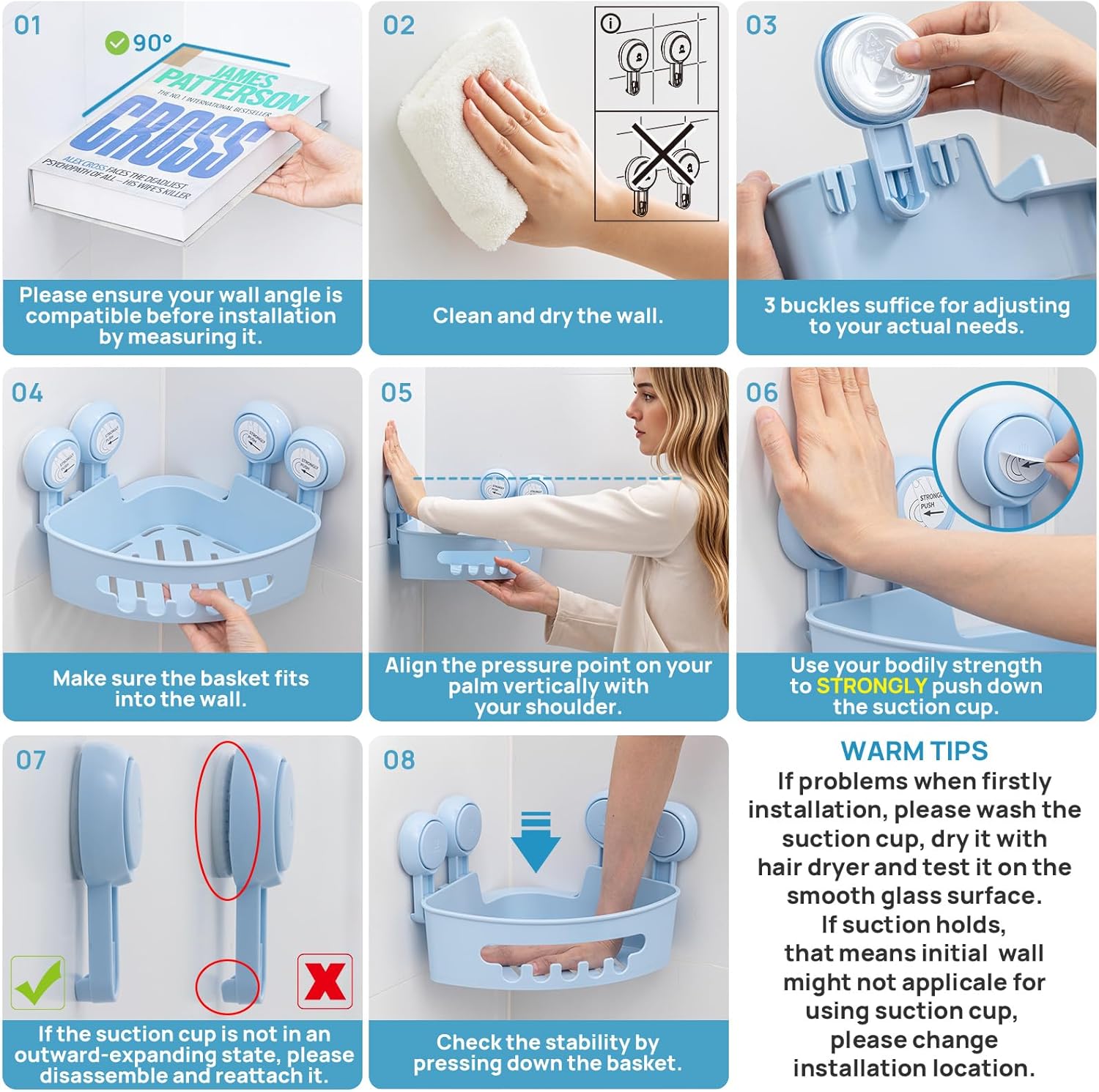 - Warm Tips: Please remember not to stick this suction cup corner shower caddy to the grout lines. This shower caddy only fits for standard 90° right angle corner. This powerful corner shower caddy works best on non-porous, impermeable, smooth surfaces such as glass, mirror, polished metal, stainless steel, plastic board, wall tile, grainy granite, etc. If you experience any problems during initial installation, please wash the suction cup, dry it with a hairdryer and test it on a smooth glass surface. If the suction holds, it means the original wall may not be suitable for using the suction cup, please change the installation location