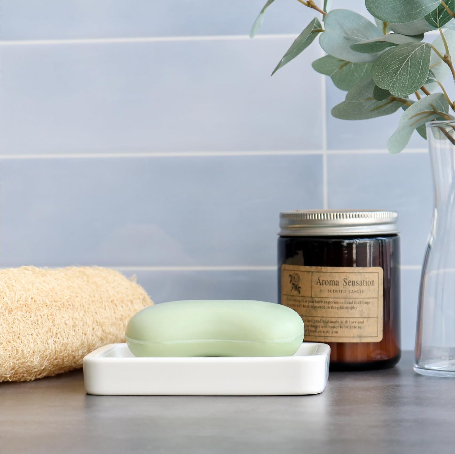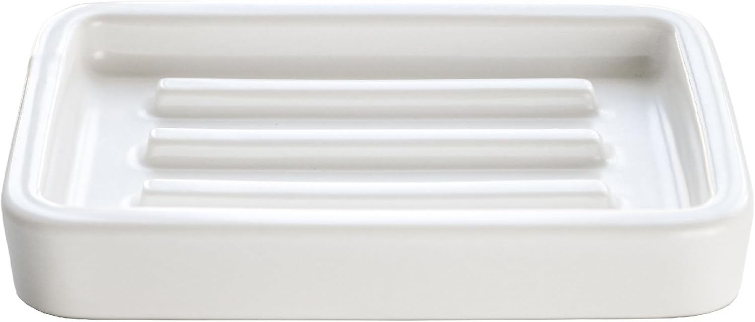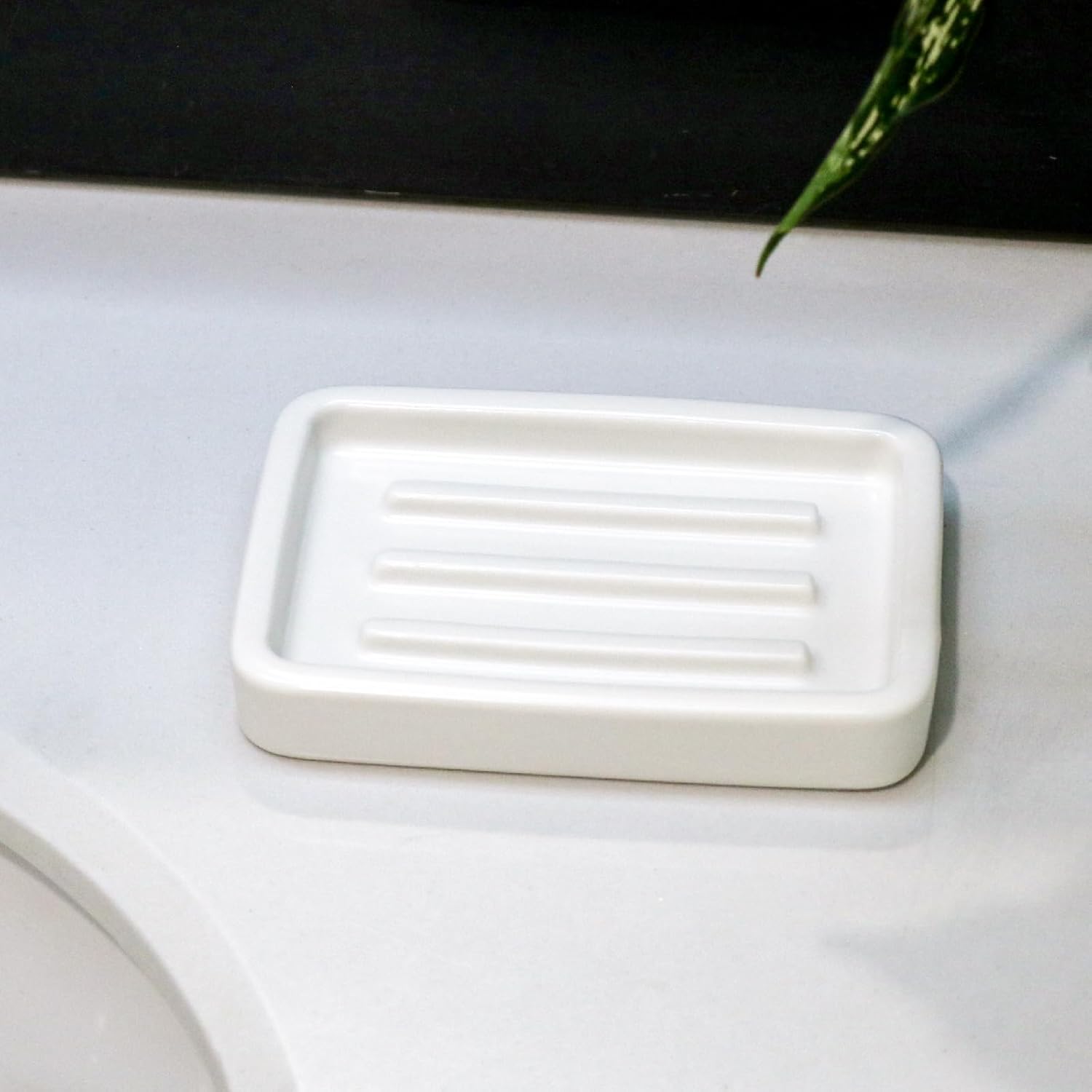 Matte Ceramic Soap Dish with Raised Ridges, Rectangle Bar Soap Holder for Bathroom Counter, Shower and Kitchen Sink, White