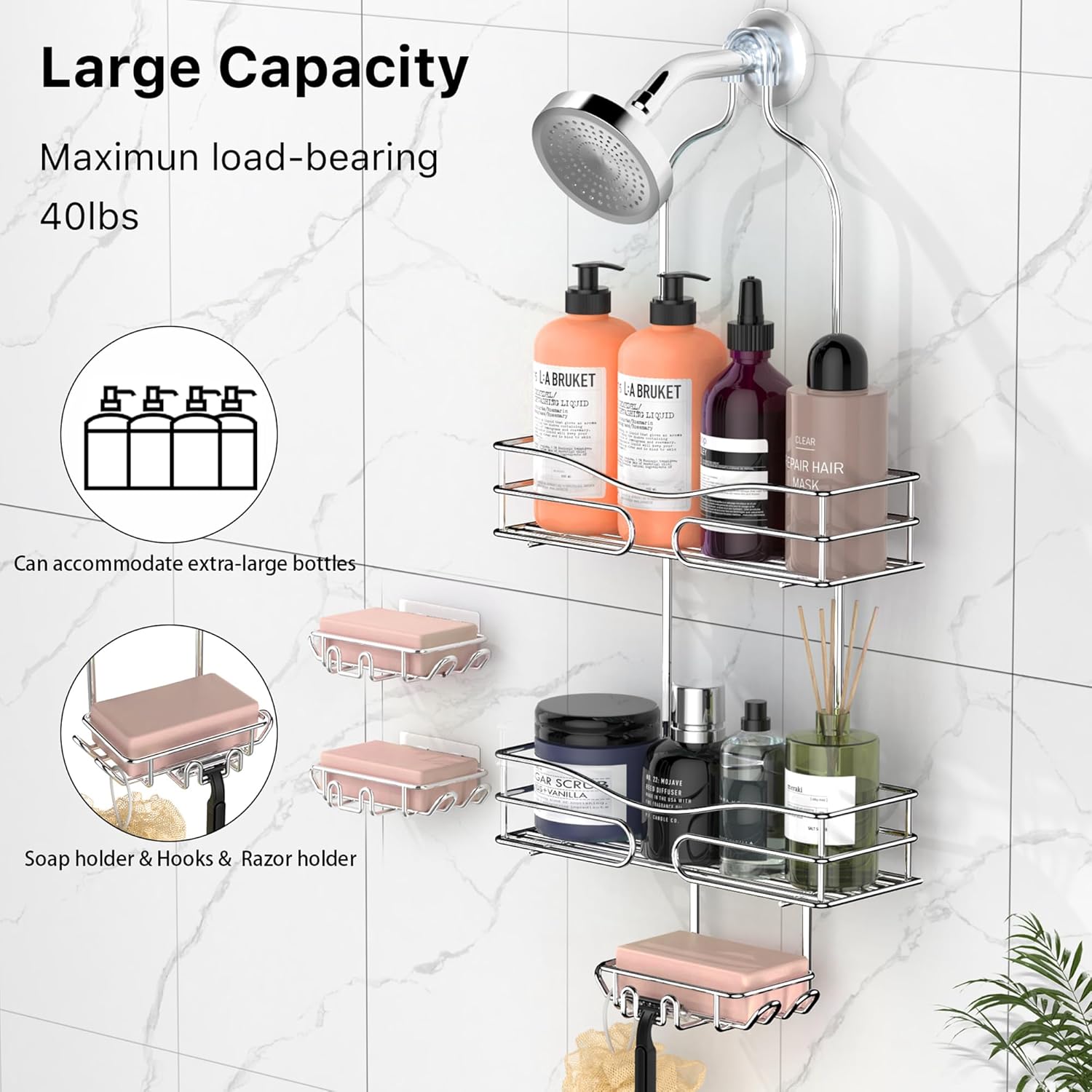 Over the Shower Head Caddy - 3 Tier Shower Caddy Hanging, Rustproof, Bathroom Rack Organizer With Hooks, Razor&Soap Holder, Brushed Nickel