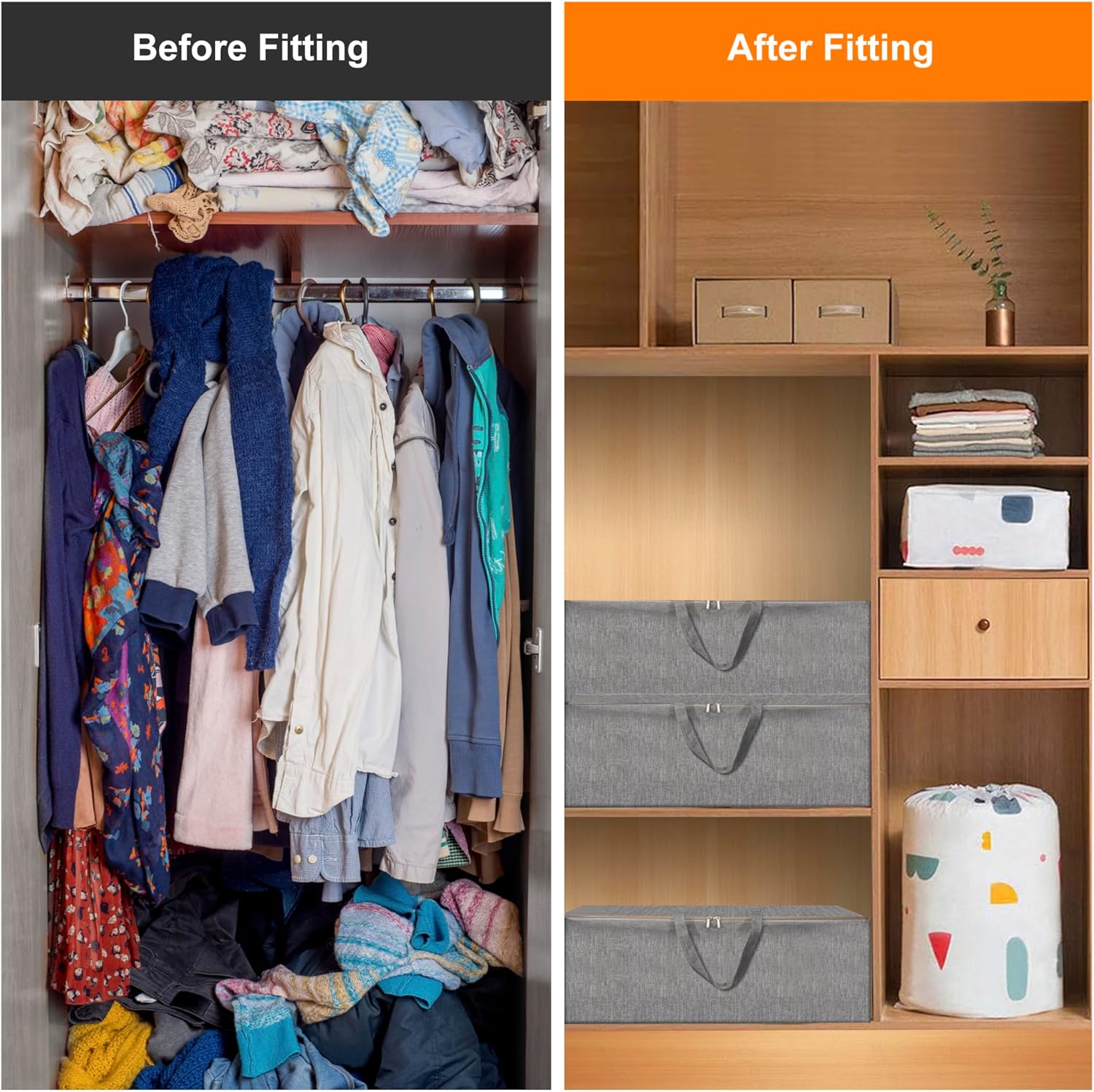 - 【Upgraded Storage Bags for Comforters and Blankets】Compared with common fabric, this storage bag organizer is made of advanced cationic fabric, which is softer and more breathable than oxford fabric, and stronger and more durable than non-woven fabric. Kind Note: The bag will keep its shape while full for stacking or while carrying by the handle, perfect for storage larger items or moving.