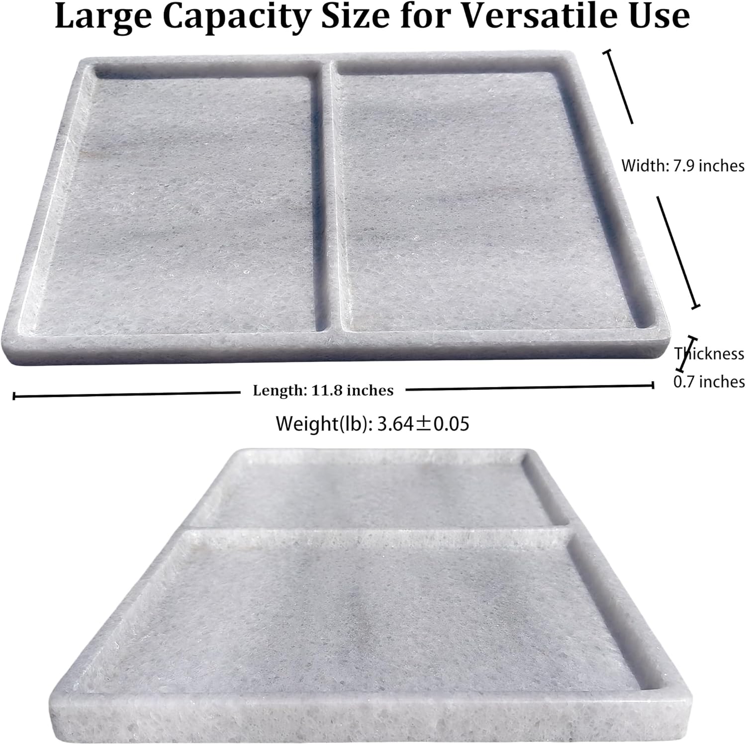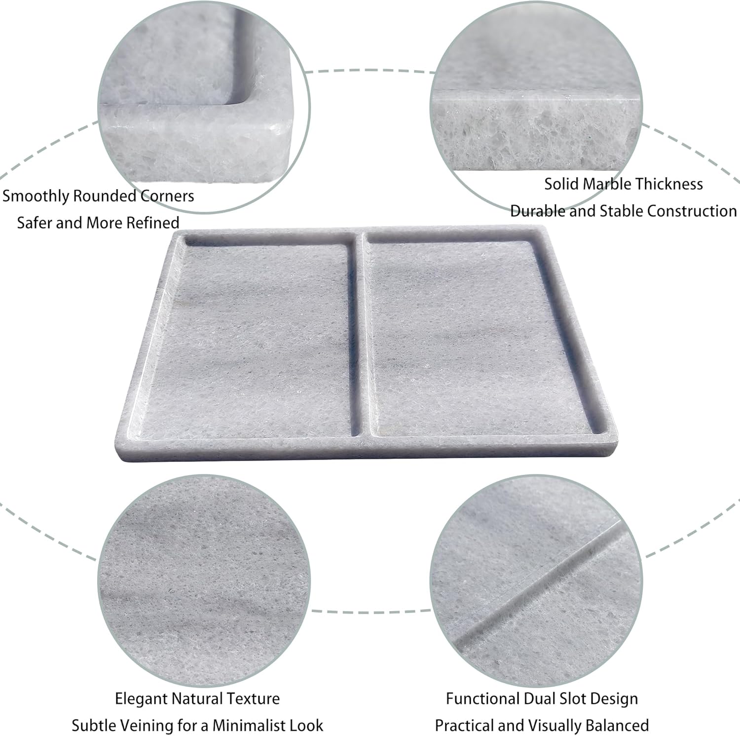 10"x8" Natural Marble Decorative Tray – Dual‑Compartment Stone Vanity Organizer for Jewelry, Keys & Soap – Premium Heat‑Resistant Bathroom Decor Gift(Belken White)