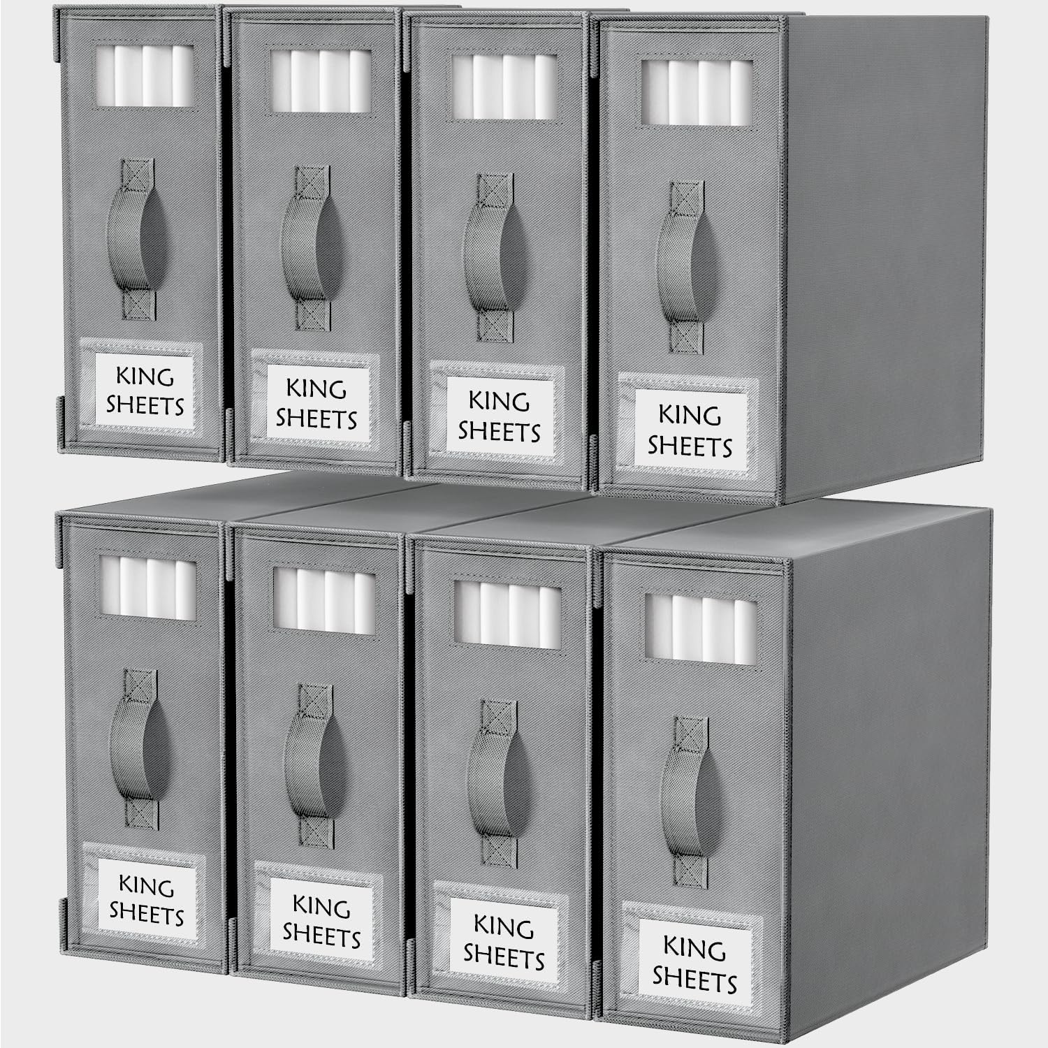 Criusia Bed Sheet Organizers and Storage, 8 Pack Foldable Linen Closet Organizer Box – Bedding Holder for Sheet Set (King/Queen Sizes), Duvet Covers, Blankets (Grey)