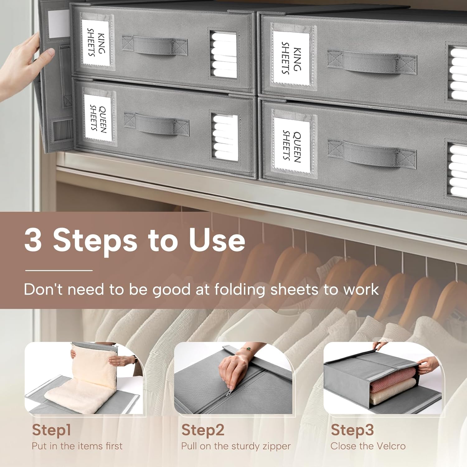- Neat & Accessible: Say goodbye to a messy linen closet! Our bed sheet organizer features a clear window and a label slot, allowing you to quickly identify the contents at a glance, keeping your sheets neatly stored and always within reach