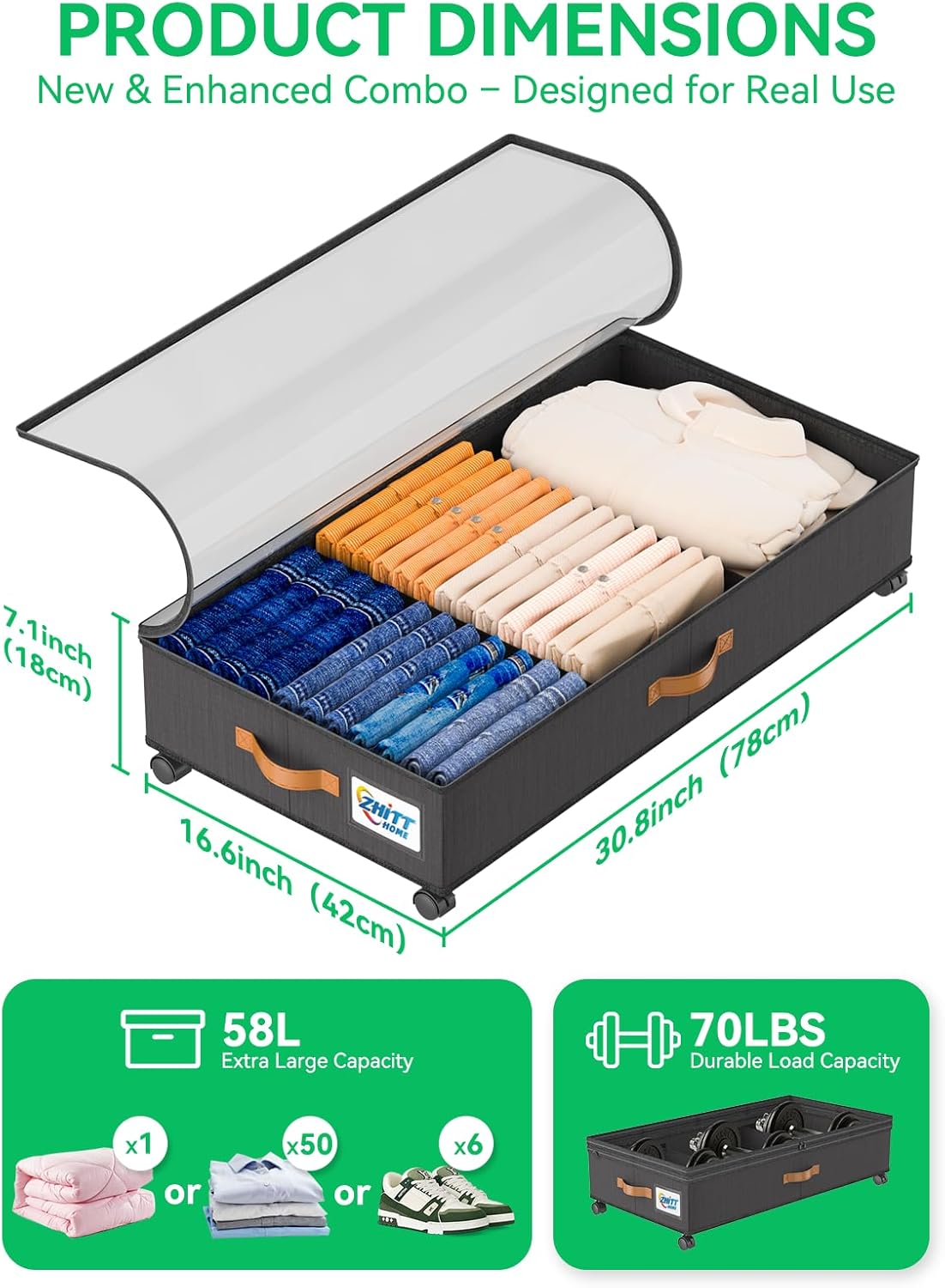 - 【360° Rotating Wheels】: ZHITTHOME Underbed container is equipped with 3 side handle and 4 smooth 360° universal wheels that glide effortlessly on various surfaces. By removing the bottom metal frame, you can easily put the storage bag on the wardrobe. Ideal storage basket for dorm room, attic, basement, and bedroom use.