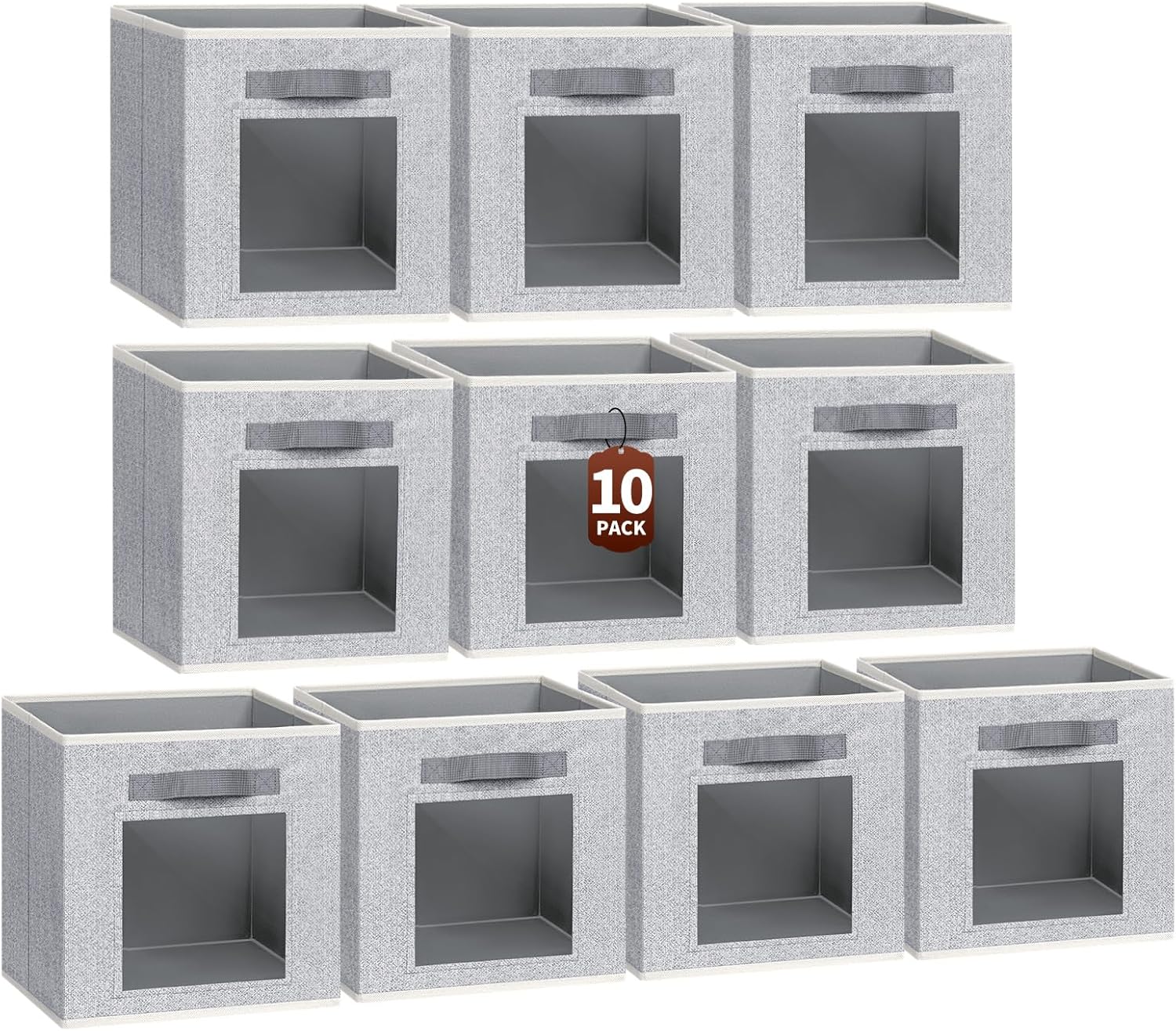 Foldable Storage Cubes - Cubby Storage Organizer with Window, Decorative Baskets for Organizing, 11 Inch Fabric Cube Shelf Bins, Set of 10, Light Gray