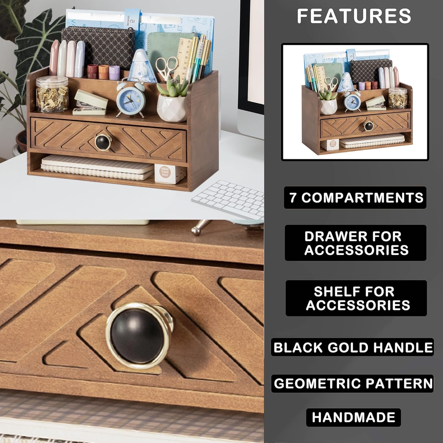 - STURDY AND DURABLE: Made of natural solid wood, this contemporary desk organizer features quality construction and design for durability. Superb craftsmanship, excellent touch feeling makes it be a perfect gift choice. The most important thing, This brown office desk accessories can also be used to store cosmetics and decorate the house, placed in the bedroom, bathroom, living room and other places