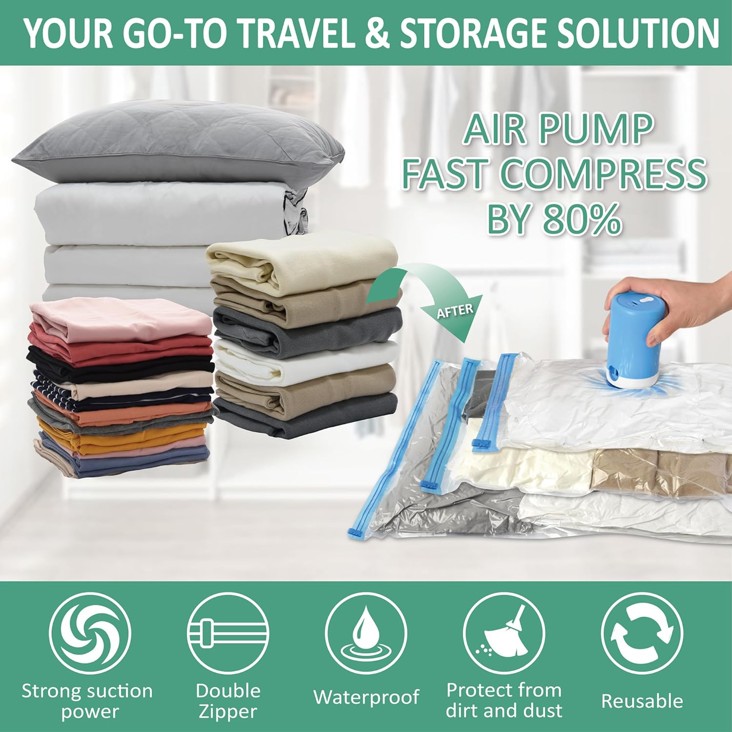 - Unlock your storage capacity with our electric pump vacuum storage bags: Our space saver bags increase your storage space by up to 80%. Utilize the electric pump to effortlessly compress clothes, duvets, pillows, bedding, and more into your wardrobe, suitcase, or underbed storage within minutes, guarding your items and keeping an organized space.