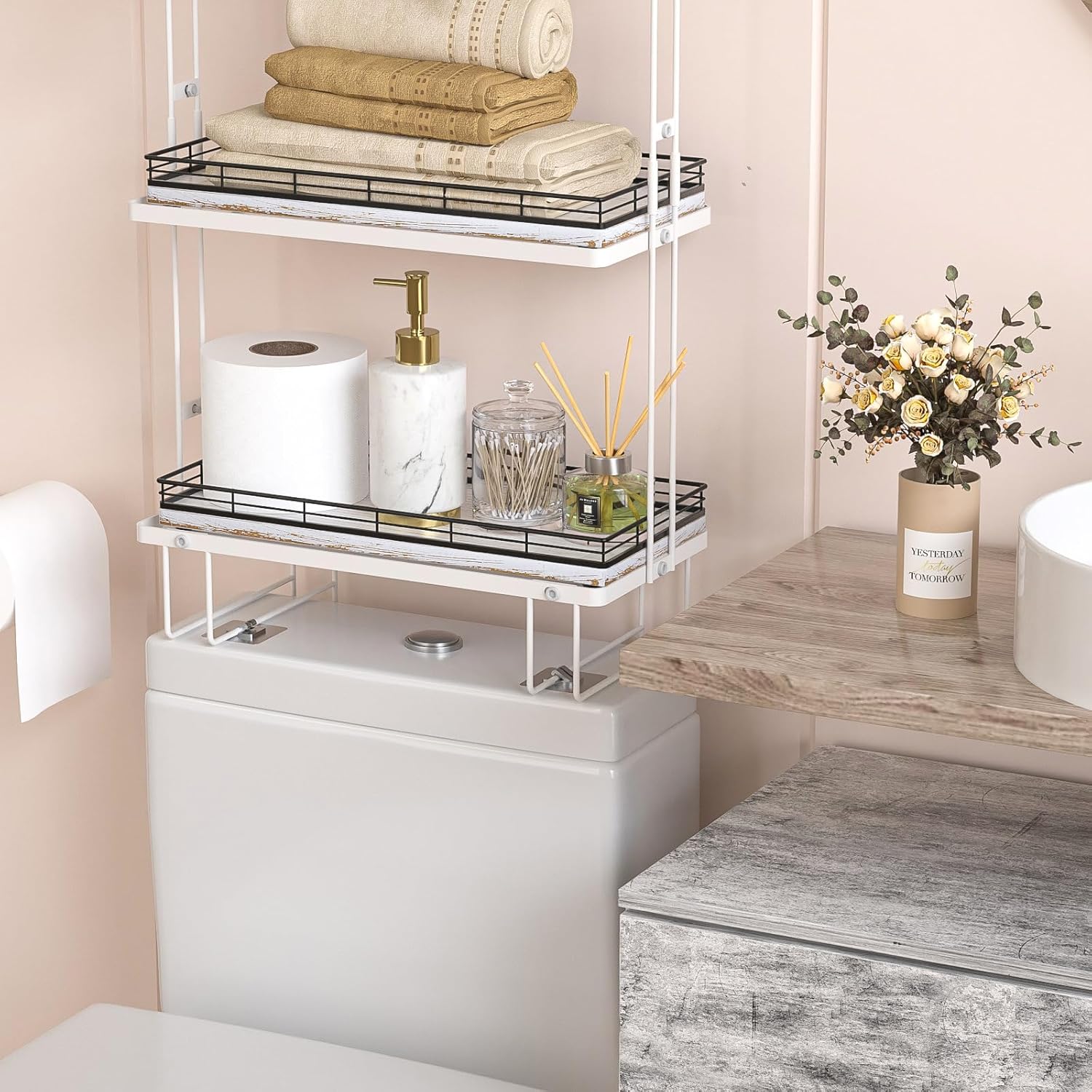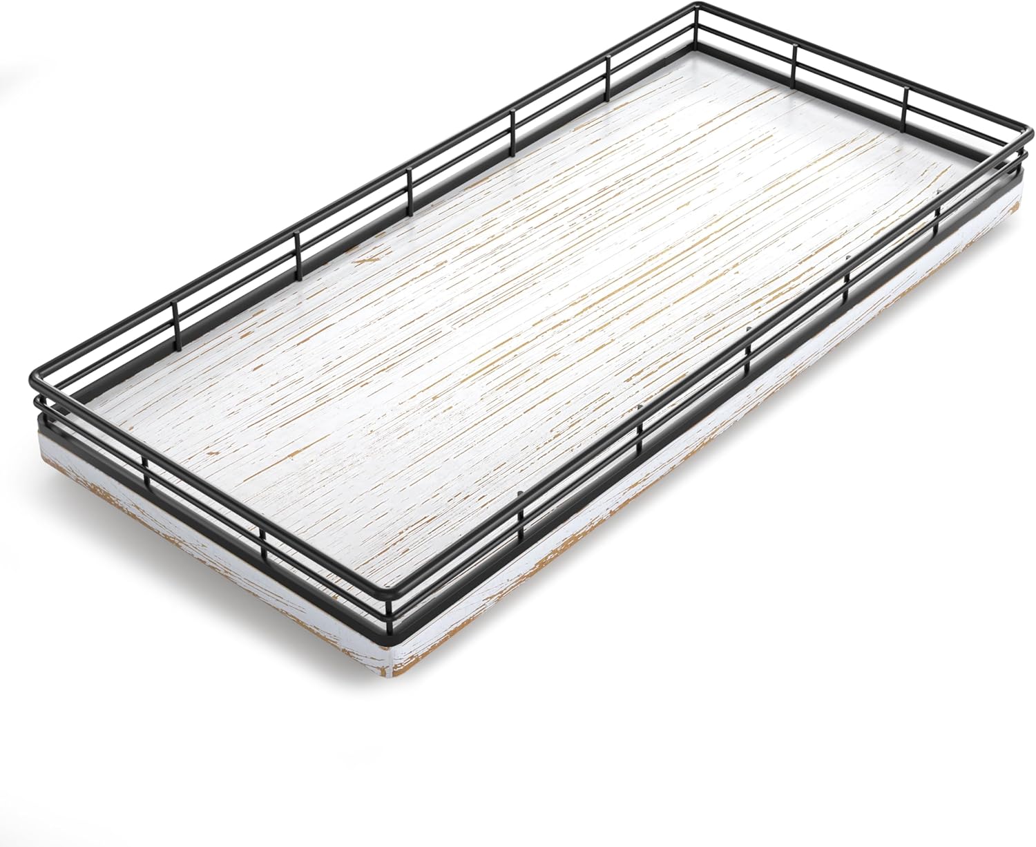 - Unique Charm: This 13 inches large wood rectangle toilet tank tray ensures durability and increased load-bearing capacity; Elevate your space with a unique appearance featuring a combination of iron mesh edges and farmhouse white wood board; Distinctive and captivating grain pattern adds an exquisite touch of elegance and sophistication; This bathroom toilet organizer tray blends modern minimalism with farmhouse charm seamlessly
