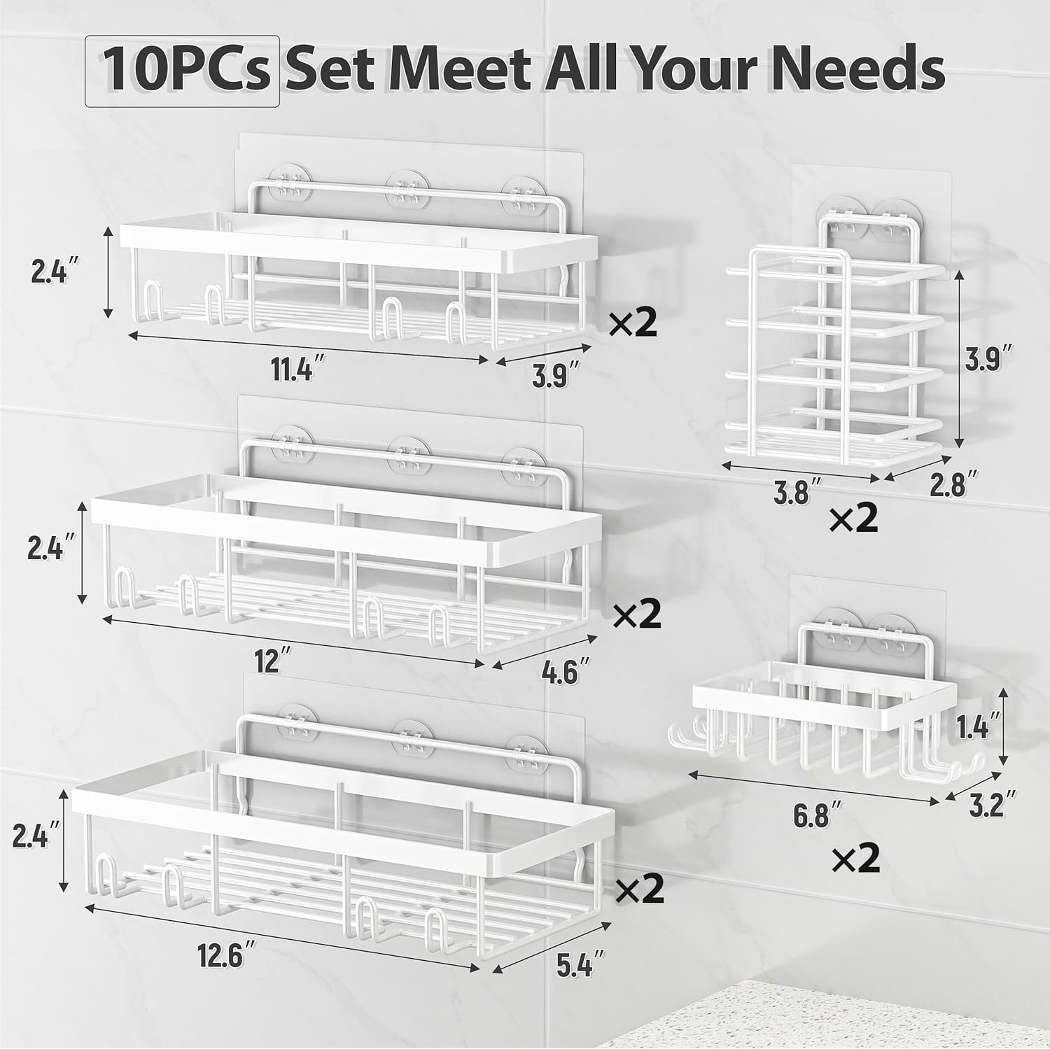 10 Pack Shower Caddy Organizer Rack Shelf for Inside Shower, Self Adhesive Wall Storage Basket Rustproof Stainless Steel Shampoo Holder Bathroom Accessory Decor Set, White