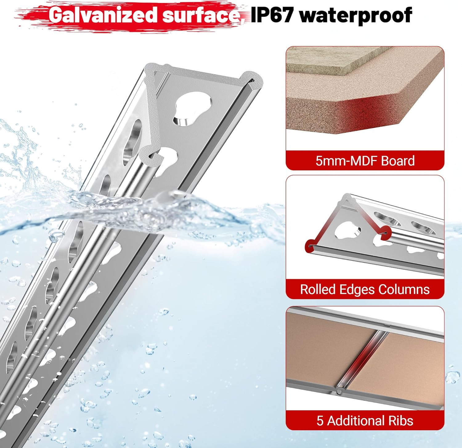 - 【Sturdy and Robust Garage Shelving】This garage shelves adopt rolled-edge thickened columns and 5 reinforced support ribs, constructed with optimized upgraded galvanized metal and long-lasting MDF boards.This thoughtful design ensures the shelving unit remains stable and secure, even under heavy loads, without wobbling or collapsing