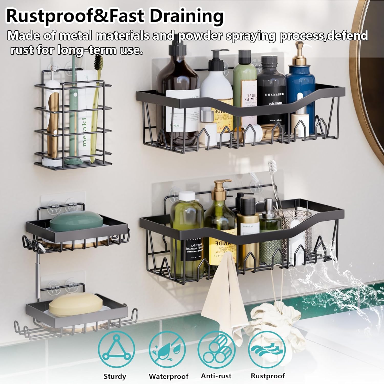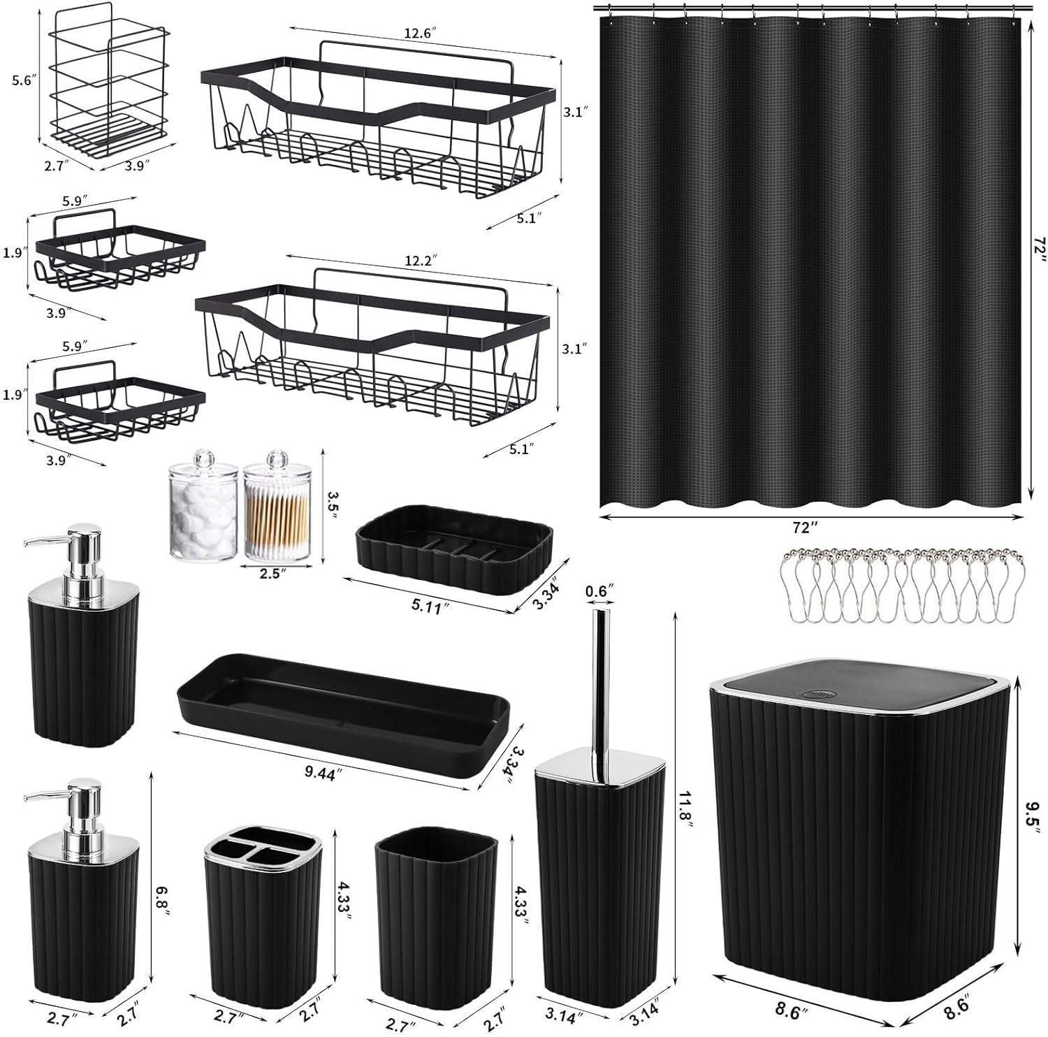 - MATERIAL: Black bathroom set made out of premium plastic, think and sturdy. The pump head is coated stainless steel paint, prevent rust and corrosion. The various accessories inside satisfy your use of the bathroom set. Buy this bathroom accessories set, you will not need to purchase additional products. Our set is fully covered.