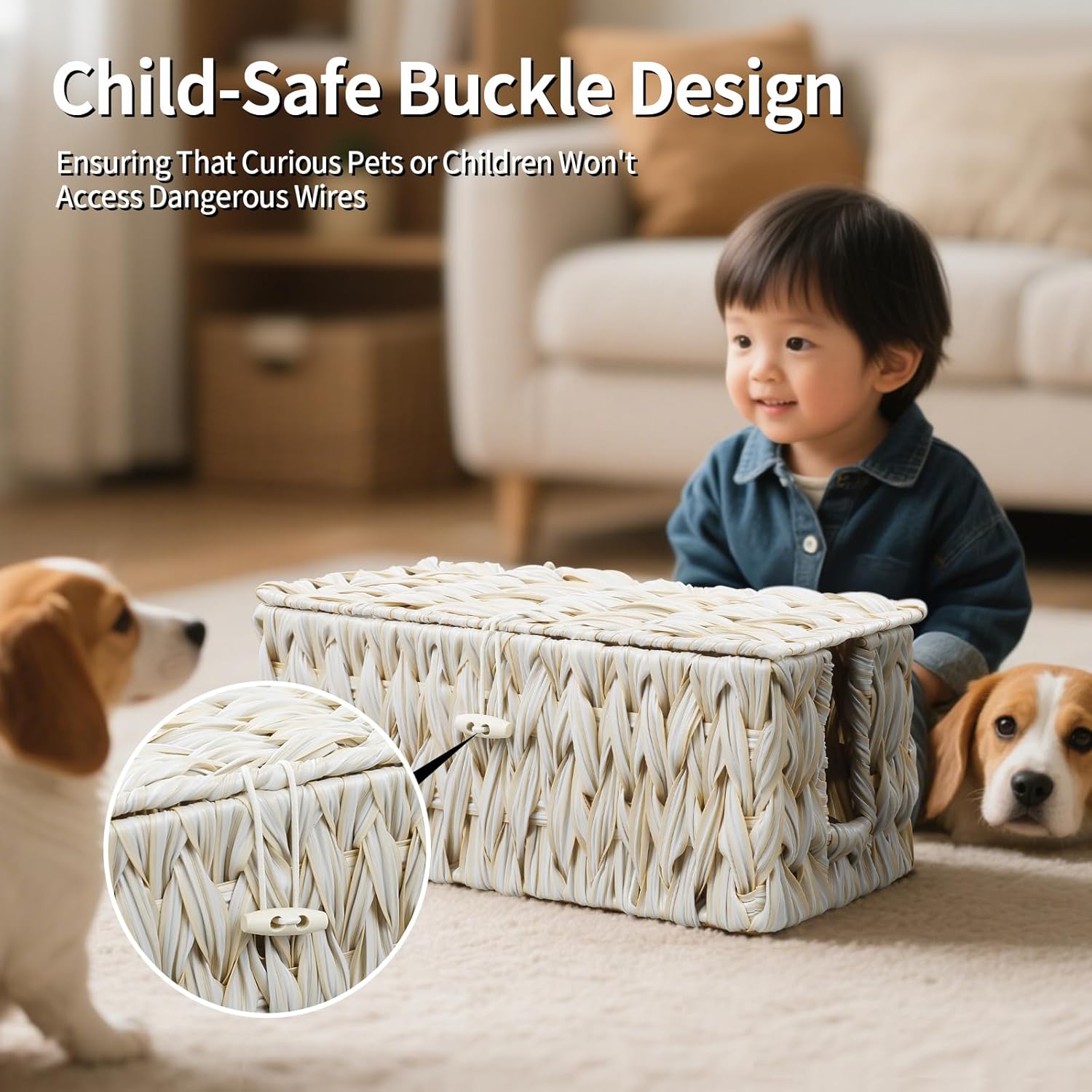 - 【Ensure Family Safety】:Keeping your home safe is our priority. The cord hider box features a child-safe design with secure clasps on one side ends, ensuring that curious pets or children won't access dangerous wires. open-weave design allows for proper airflow to prevent overheating of cablesThis cord organizer box provides a secure, safe environment by effectively hiding cables