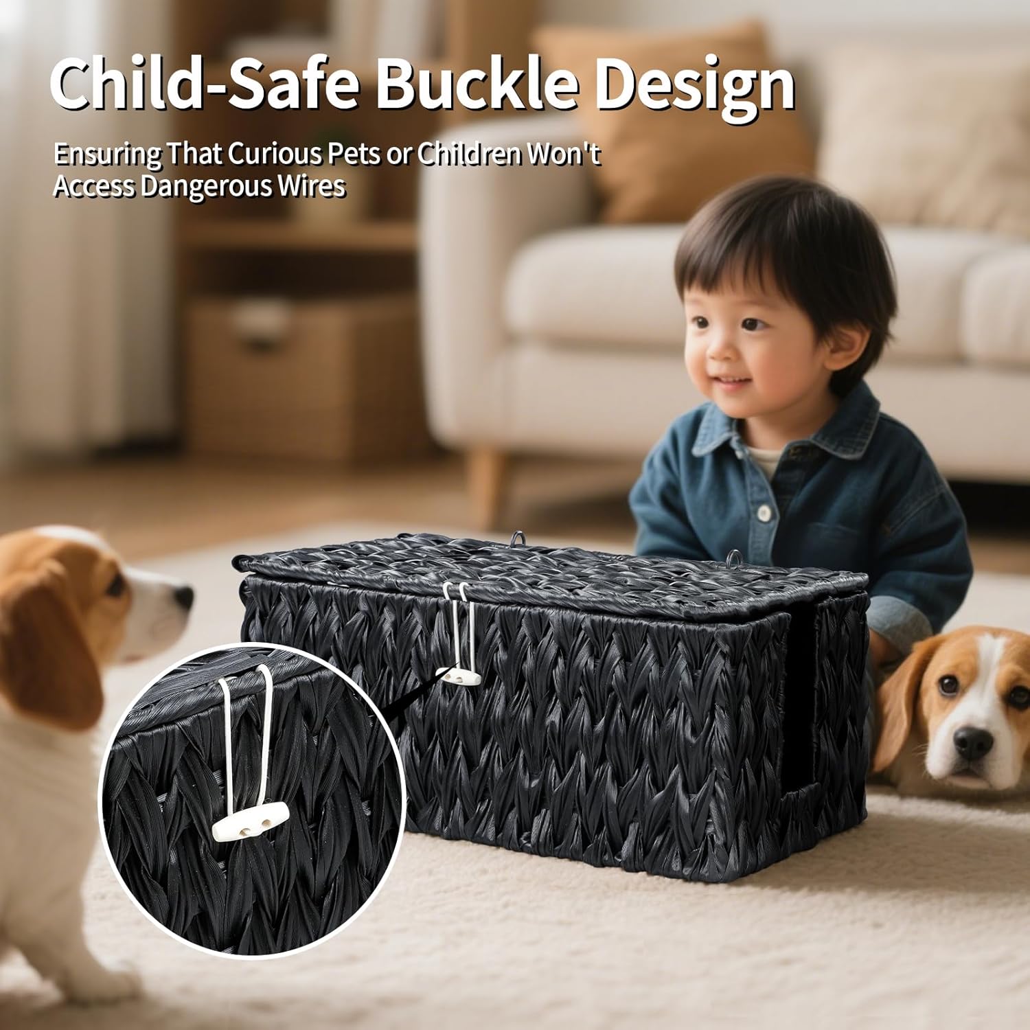 - 【Ensure Family Safety】:Keeping your home safe is our priority. The cord hider box features a child-safe design with secure clasps on one side ends, ensuring that curious pets or children won't access dangerous wires. open-weave design allows for proper airflow to prevent overheating of cablesThis cord organizer box provides a secure, safe environment by effectively hiding cables