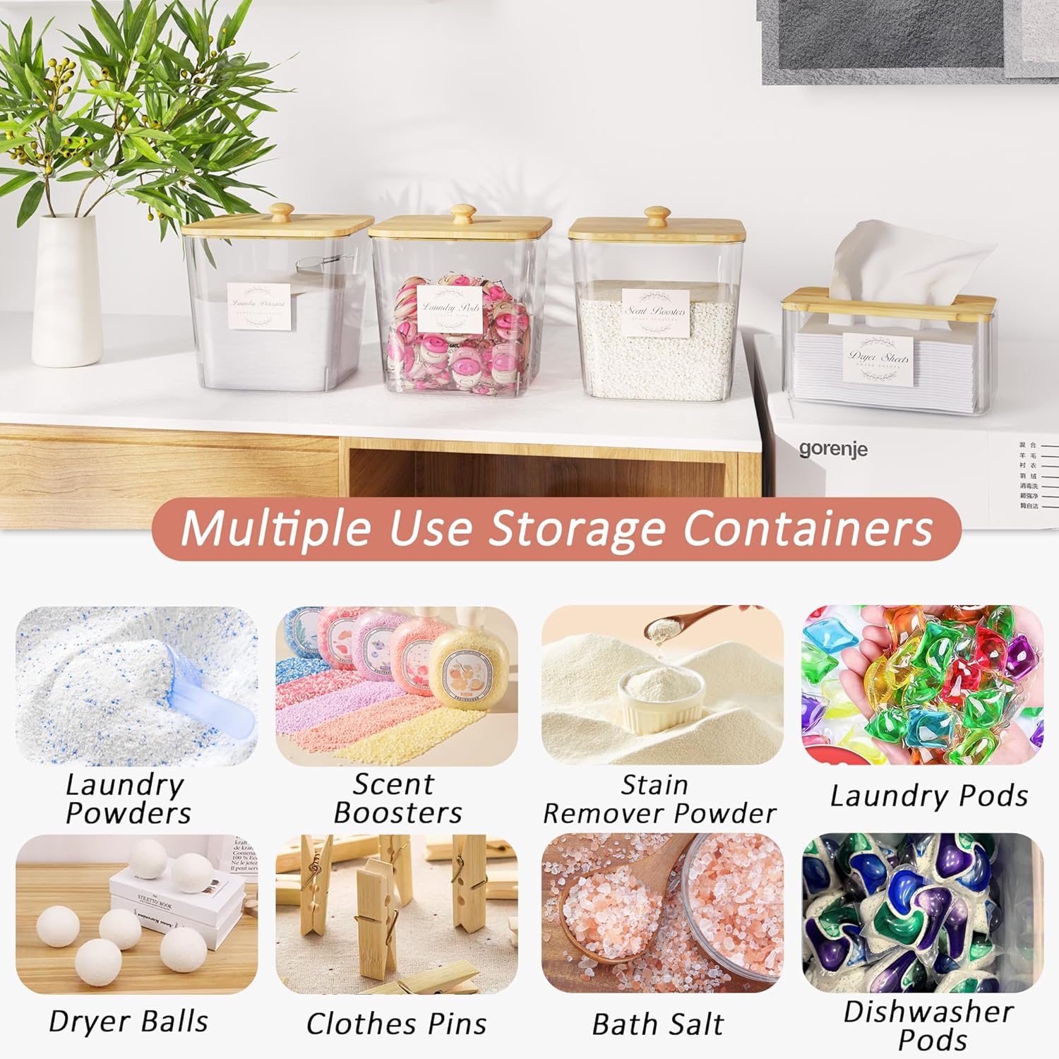 Laundry Room Organization and Storage, Laundry Pods Container and Dryer Sheet Holder with Bamboo Lids and Labels, Laundry Organizer with Scoops for Booster Beads, Powder, Pods, 3+1 Pack