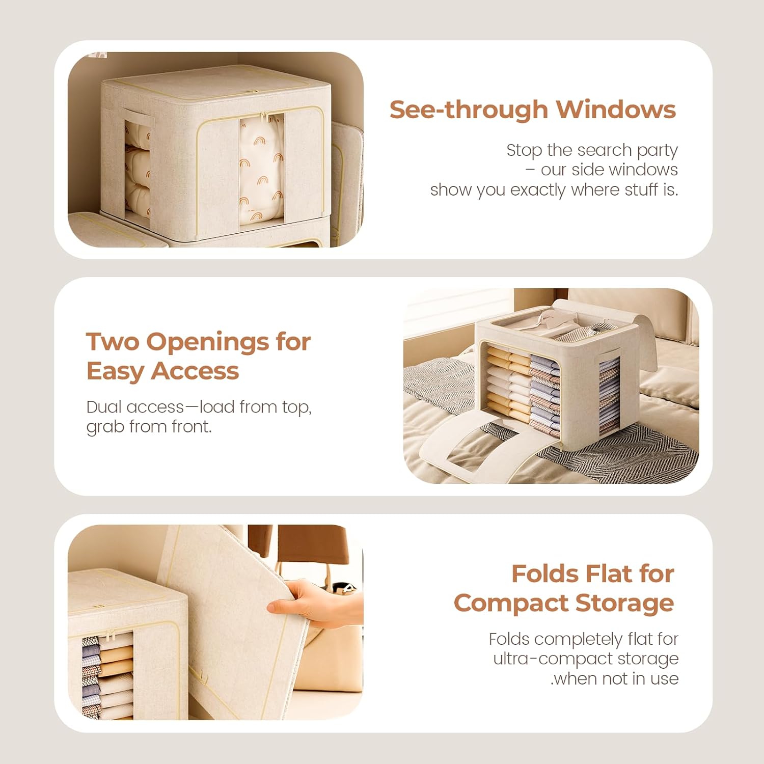 6Pack 60L Large Cloth Storage Bins with Metal Frame, Linen Storage Box with Clear Window, Stackable Sweater Storage for Closet, Clothes Storage Containers for Comforters, Blankets, Quilts, T-shirt