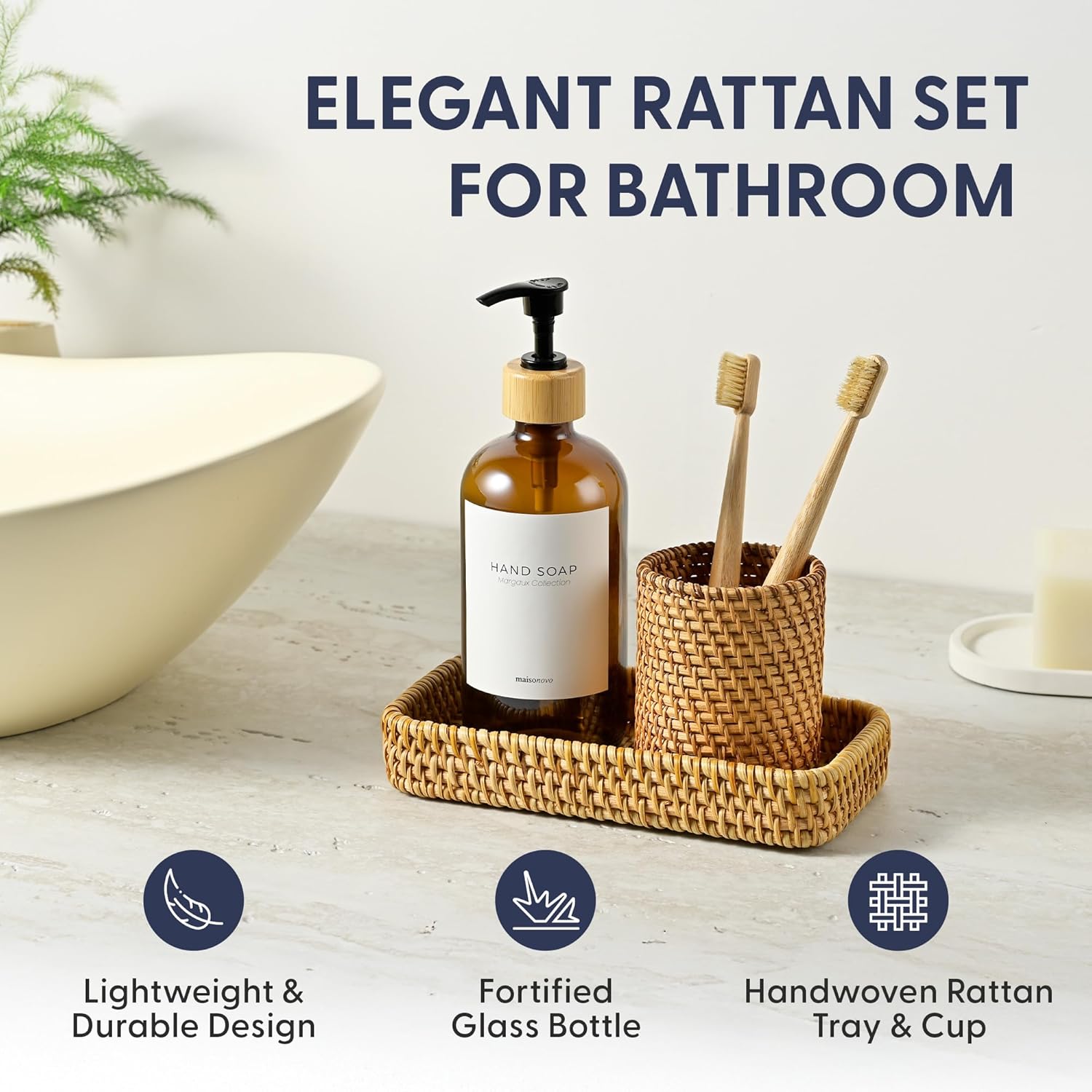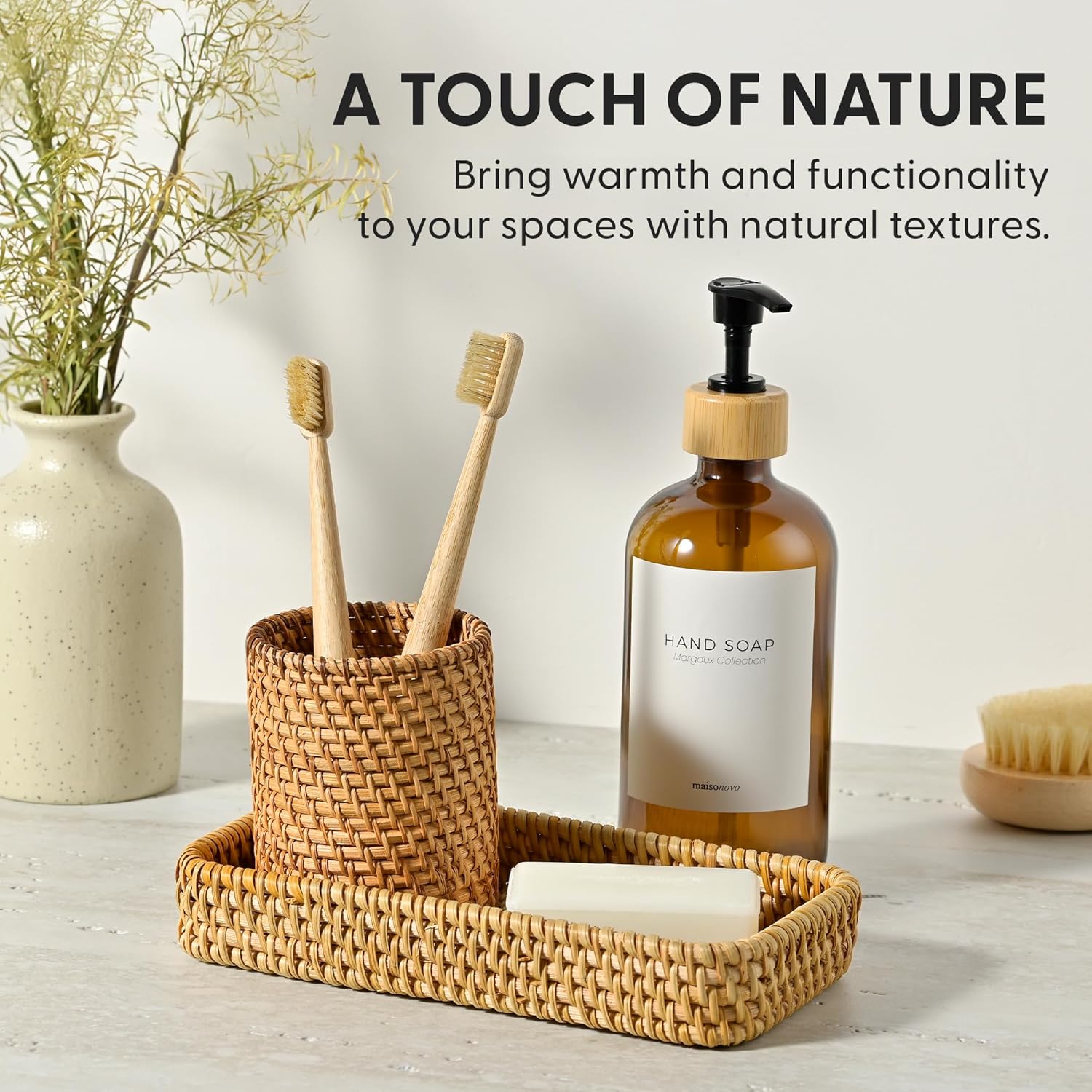 MaisoNovo Rattan Bathroom Set - Amber Countertop Dispenser, Toothbrush Holder & Toothpaste Cup with Tray - Set of 3 - Rattan Bathroom Vanity Trays Rectangle for Storage