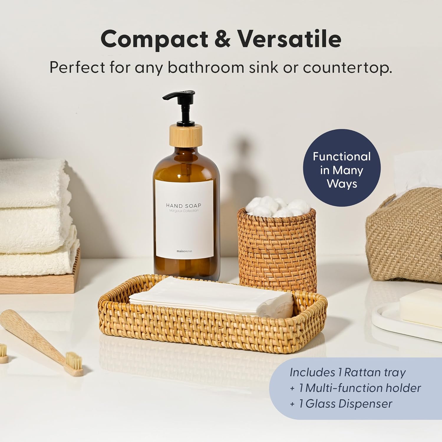 - This set includes: One countertop dispenser, rattan tray, and rattan holder — all beautifully arranged on a tray. Elevate your space with these stylish rattan bathroom accessories, neatly displayed on a durable rattan tray rectangle for a clean and natural look.