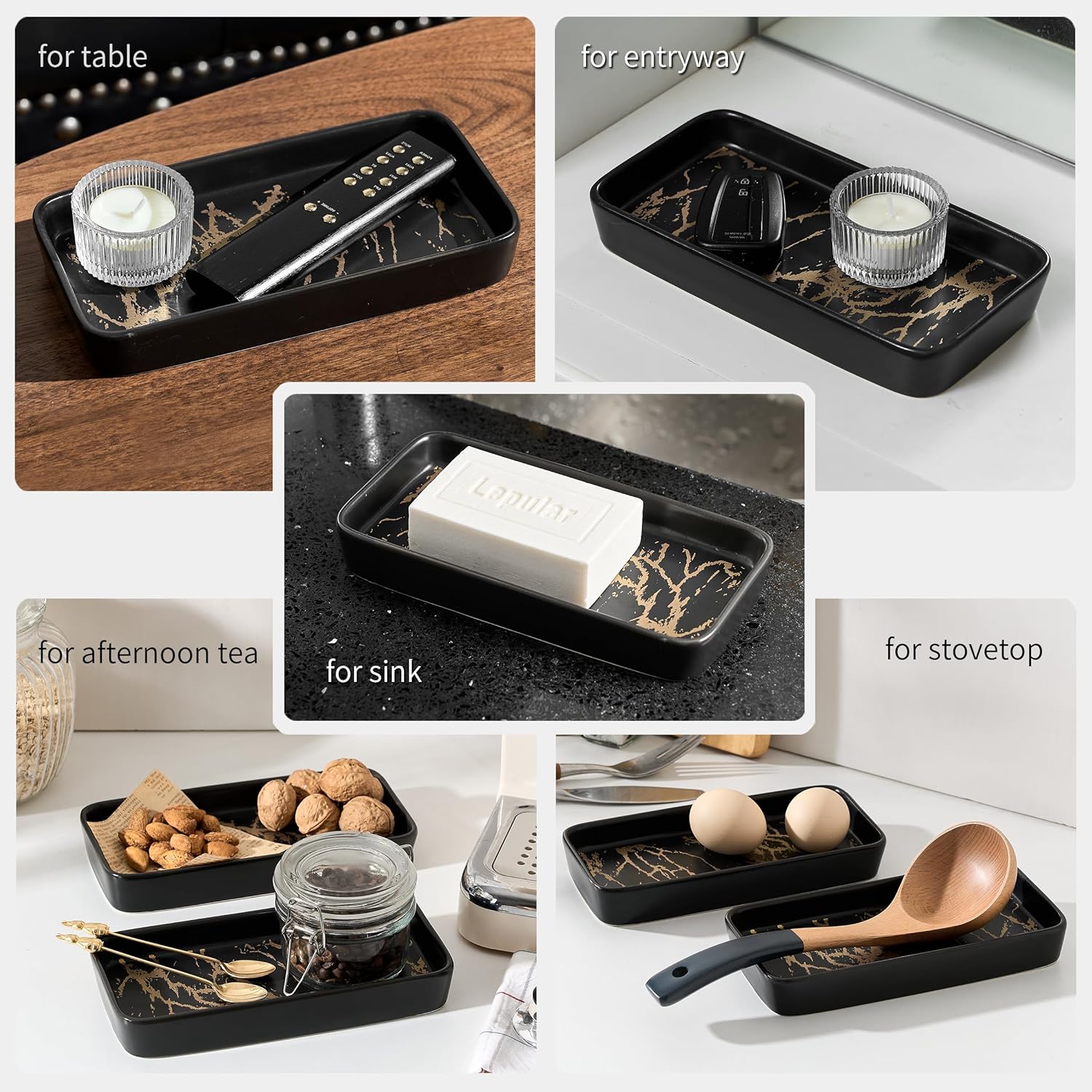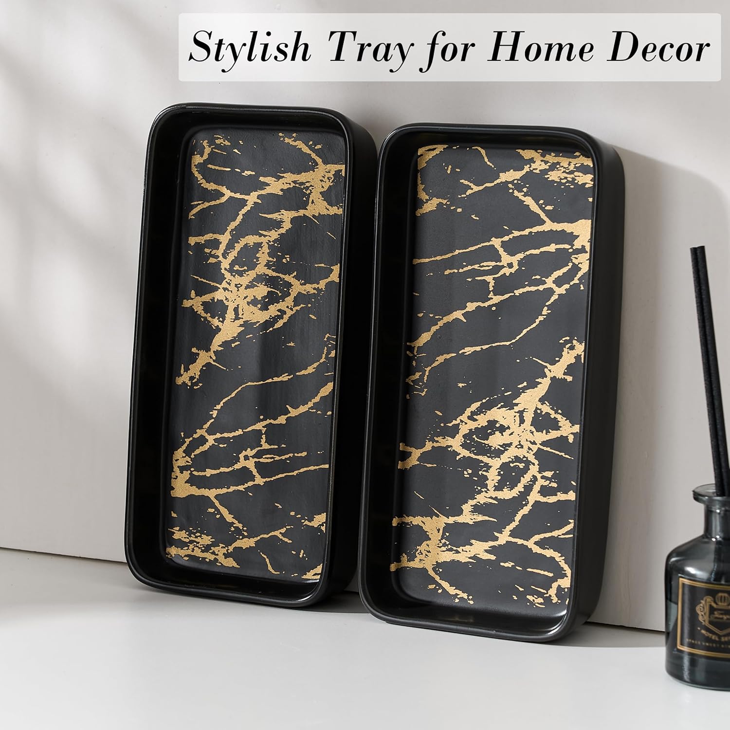 Bathroom Vanity Tray for Countertop,2PC Rectangle Marble Tray Set,Decorative Bathroom Organizer for Scrubber, Lotion Bottles, Perfume, Jewelry, Candle, Key Trinket Ring(Small,Black)