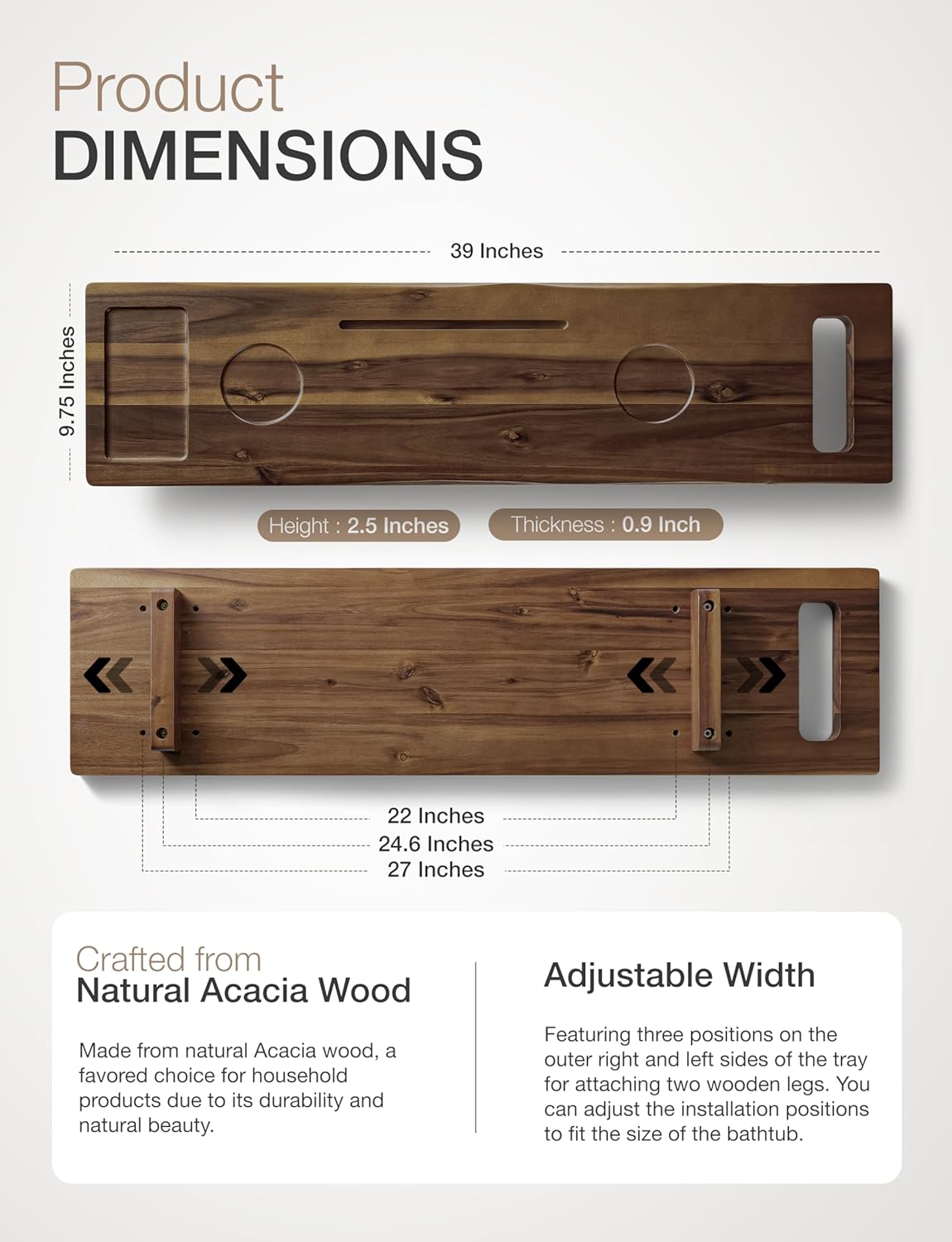 - Precise Dimensions: Measuring 39 inches in length, 9.75 inches in width, and 2.5 inches in height, with a tray depth of 0.9 inches, providing ample space for various items during your bath