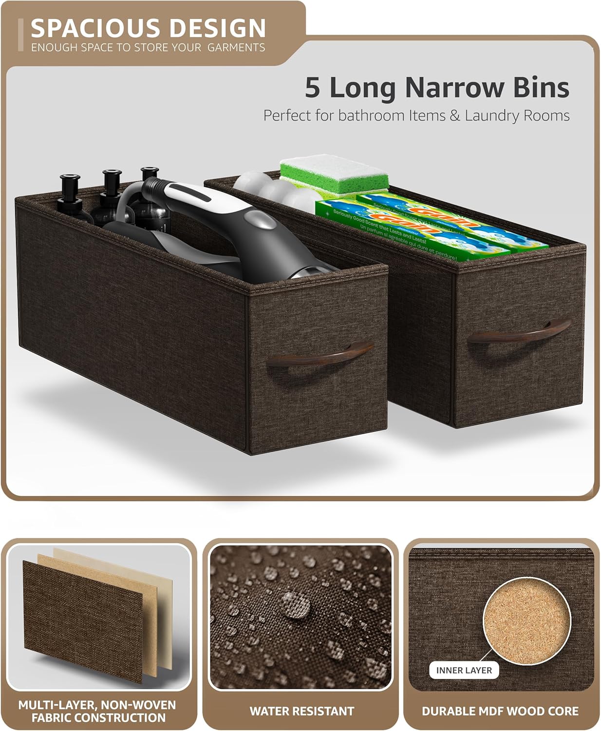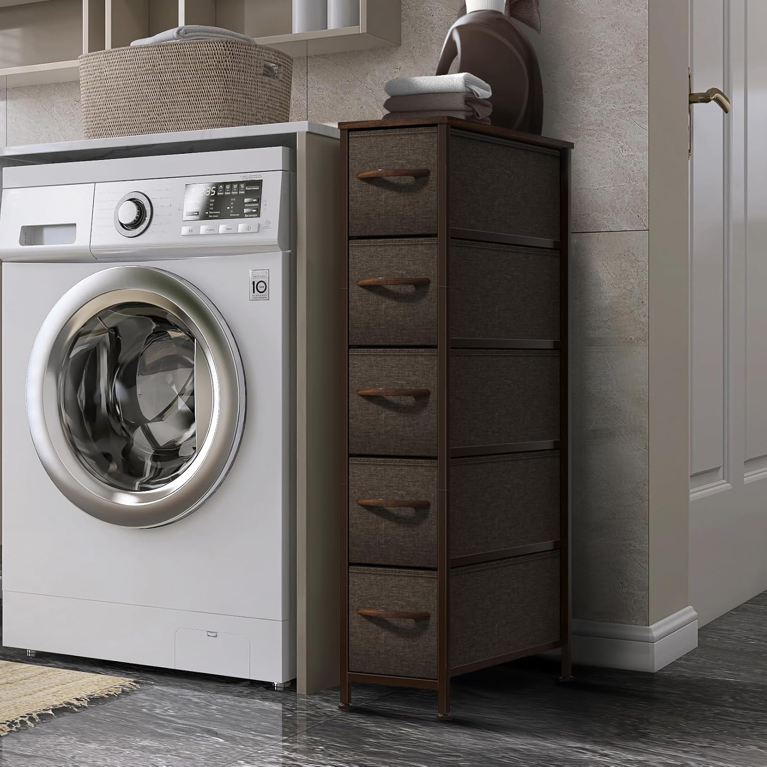 - Narrow 5 Drawer Dresser: This multipurpose bedroom dresser can be used as an end table, side table, or bedside table to store clothes, blankets, linens, lingerie, purses, scarves, socks, accessories, toiletries, makeup, cosmetics, office supplies, games, books, and more