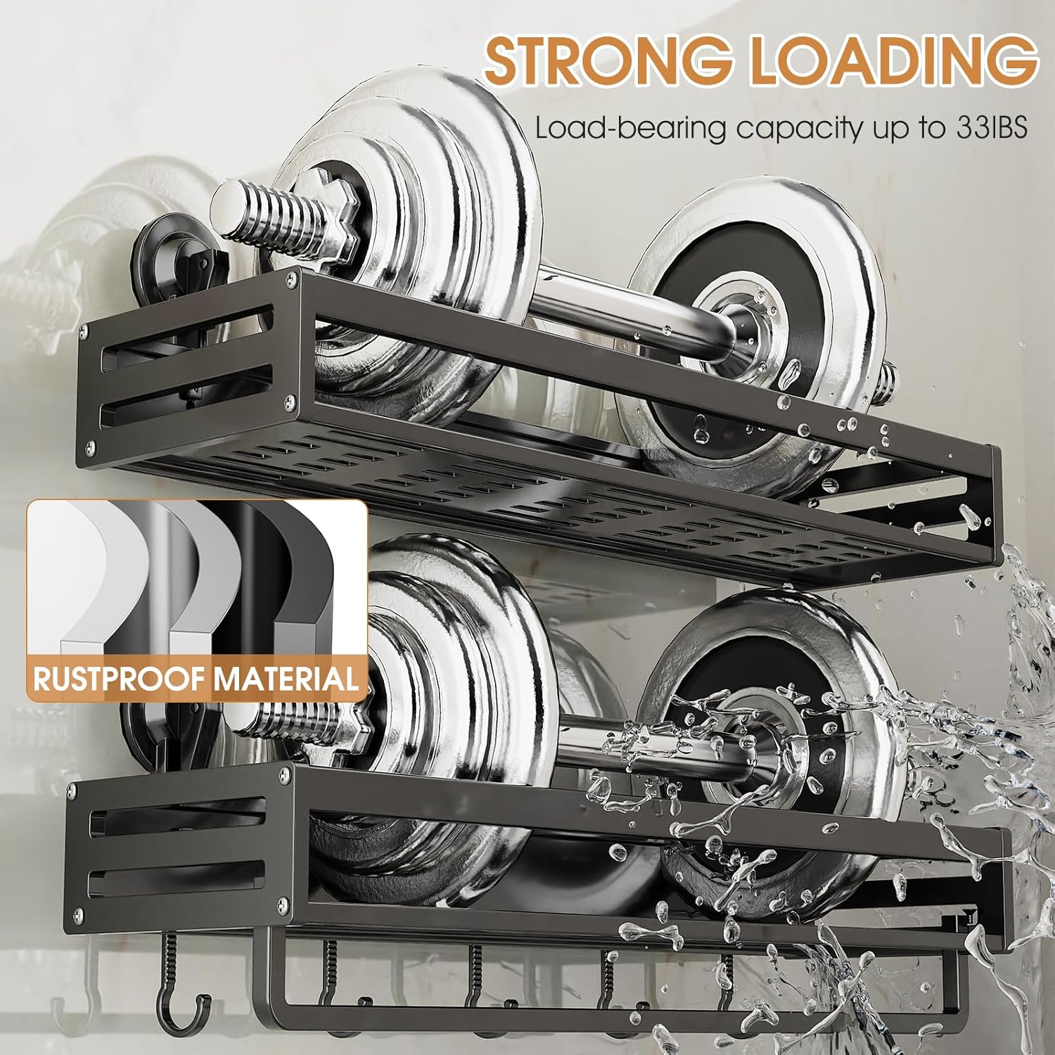 - Powerful & Durable Vacuum Suction: Engineered with dual vacuum suction cups, our shower caddy locks securely in seconds by simply lifting the lever, pressing down, and sealing the lever, and pull the lever back down .Holds up to 33 lbs effortlessly—ideal for heavy bottles, toiletries, and bath essentials.