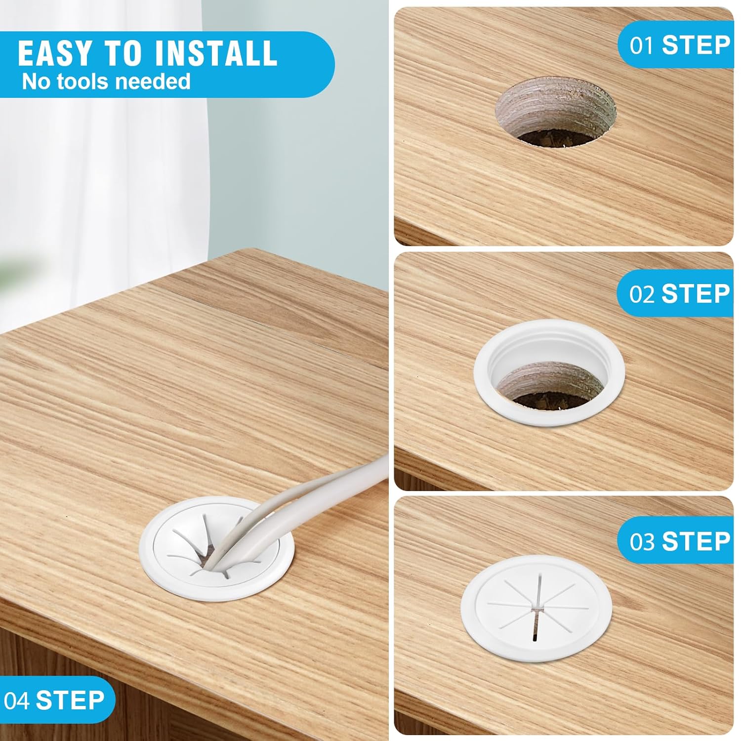 - DELIGHTS PACKAGE -- Your package includes 2 x 2" desk grommets. Useful Tips: ① Make sure the hole's edges are smooth and free of splinters that could damage your cables or the grommet, ② Place the grommet into the hole. It should fit snugly, ③Finally, route your cables through the desk grommet.