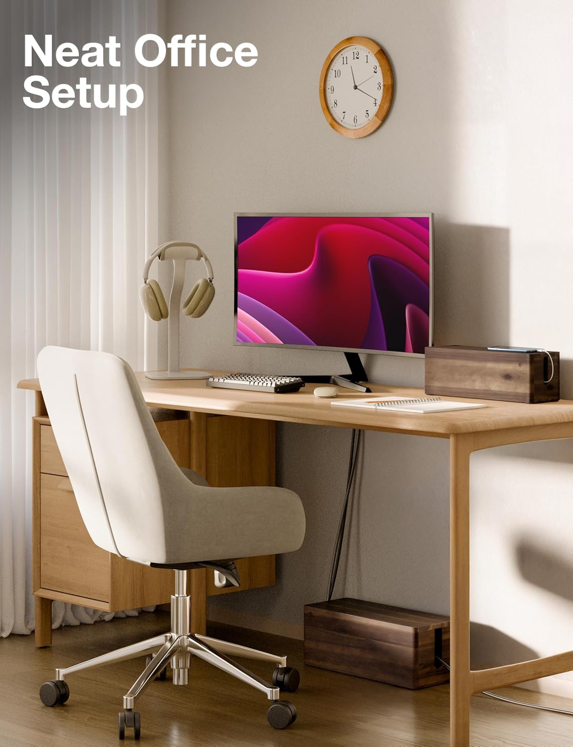 - Natural Acacia Wood: Crafted from solid acacia and finished in a walnut tone, each cable management box showcases a distinctive wood pattern for a warm, natural touch. A premium alternative to plastic cable organizer boxes, this wooden cable management box adds timeless elegance to any home or office setup