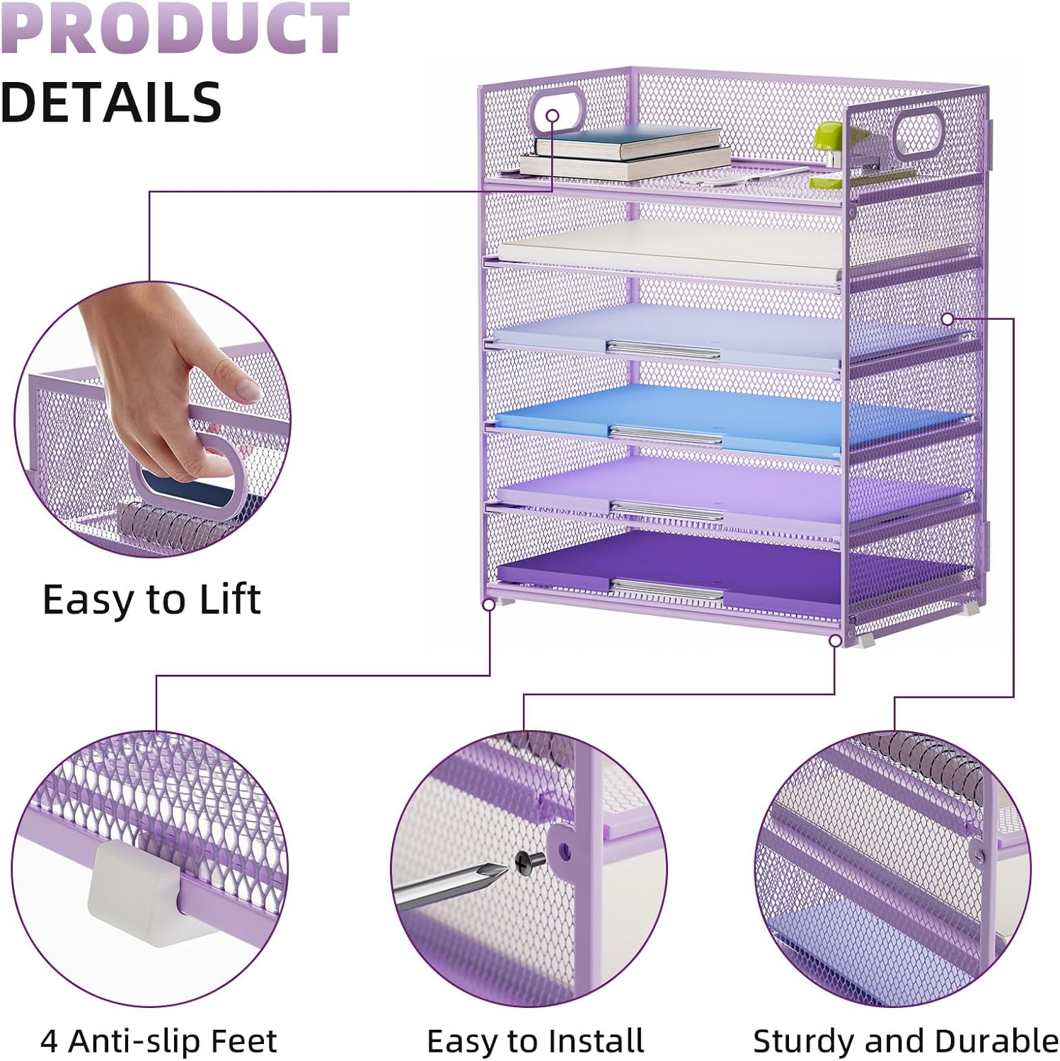 Marbrasse 2 Pack Desk Organizer with Handle, 6 Tier Paper Letter Tray, Mesh Desk File Organizer for Office, School and Home - Purple