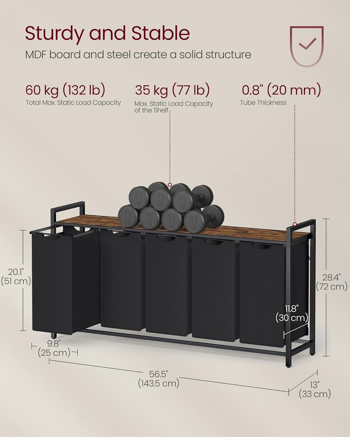 VASAGLE Laundry Hamper, Laundry Basket, Laundry Sorter with 5 Pull-Out and Removable Bags, Shelf, Metal Frame, 5 x 10.6 Gallons (40 L), 56.5 x 13 x 28.4 Inches, Ink Black and Rustic Brown UBLH501B01