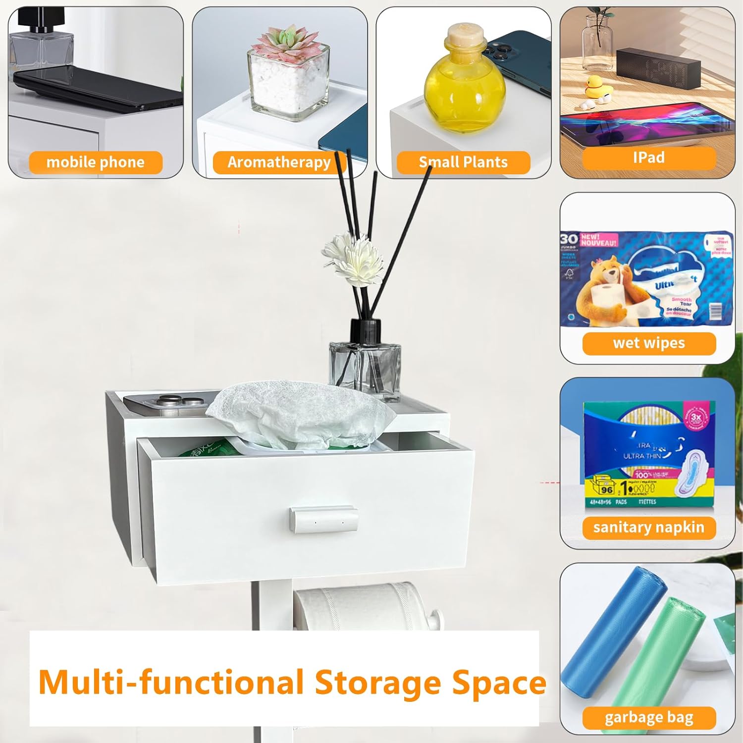 - 4-IN-1 DESIGN:This freestanding wooden toilet paper holder with storage combines a roll rod, a top drawer for wipes or cell phones, extra toilet paper storage, and a convenient shelf. It holds up to 7 rolls at once, making it a practical bathroom organizer