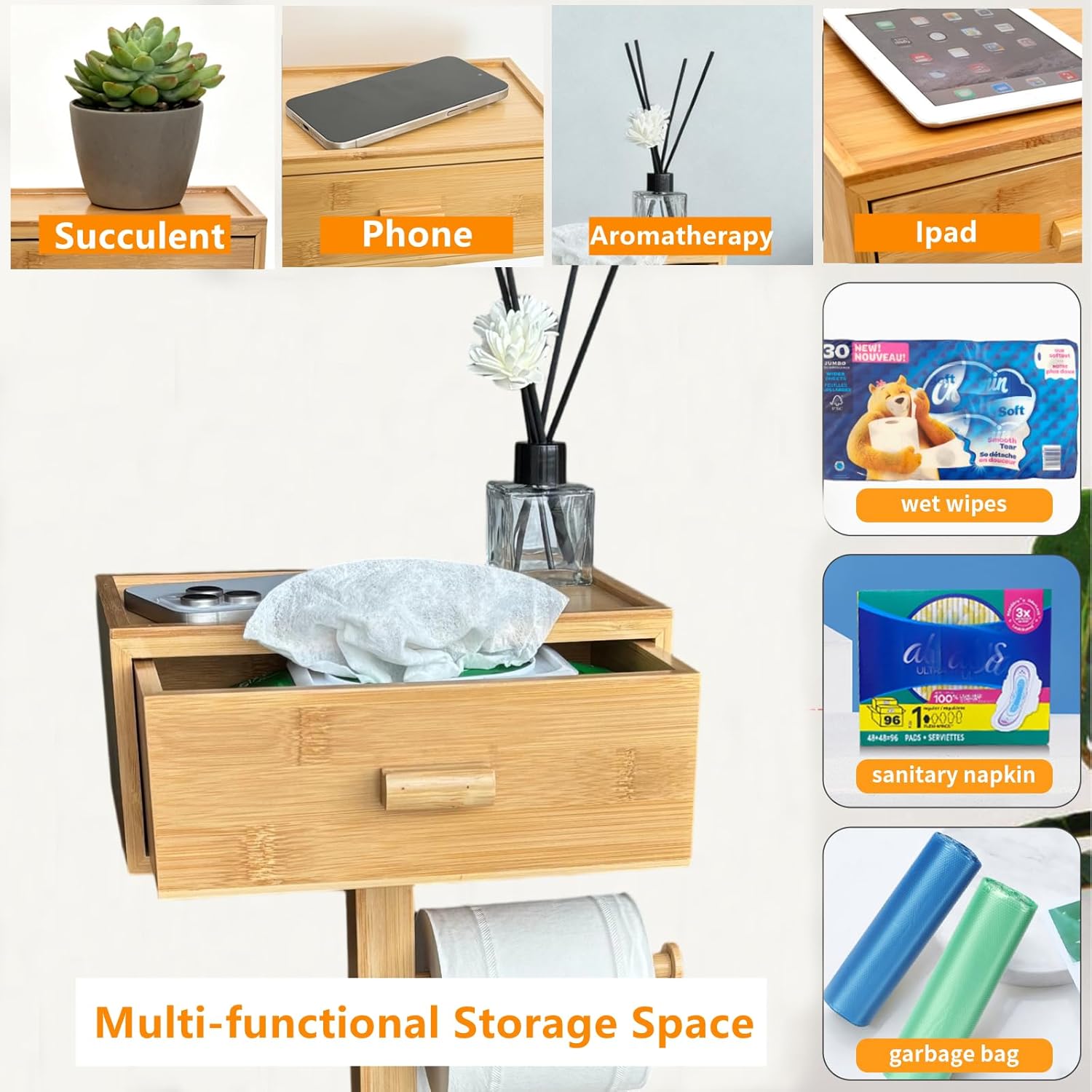 - 4-IN-1 DESIGN:This freestanding bamboo toilet paper holder with storage combines a roll rod, a top drawer for wipes or cell phones, extra toilet paper storage, and a convenient shelf. It holds up to 7 rolls at once, making it a practical bathroom organizer