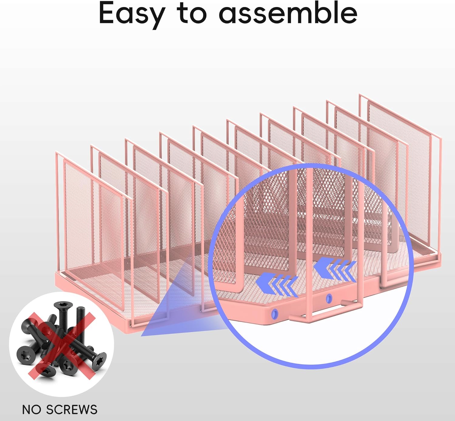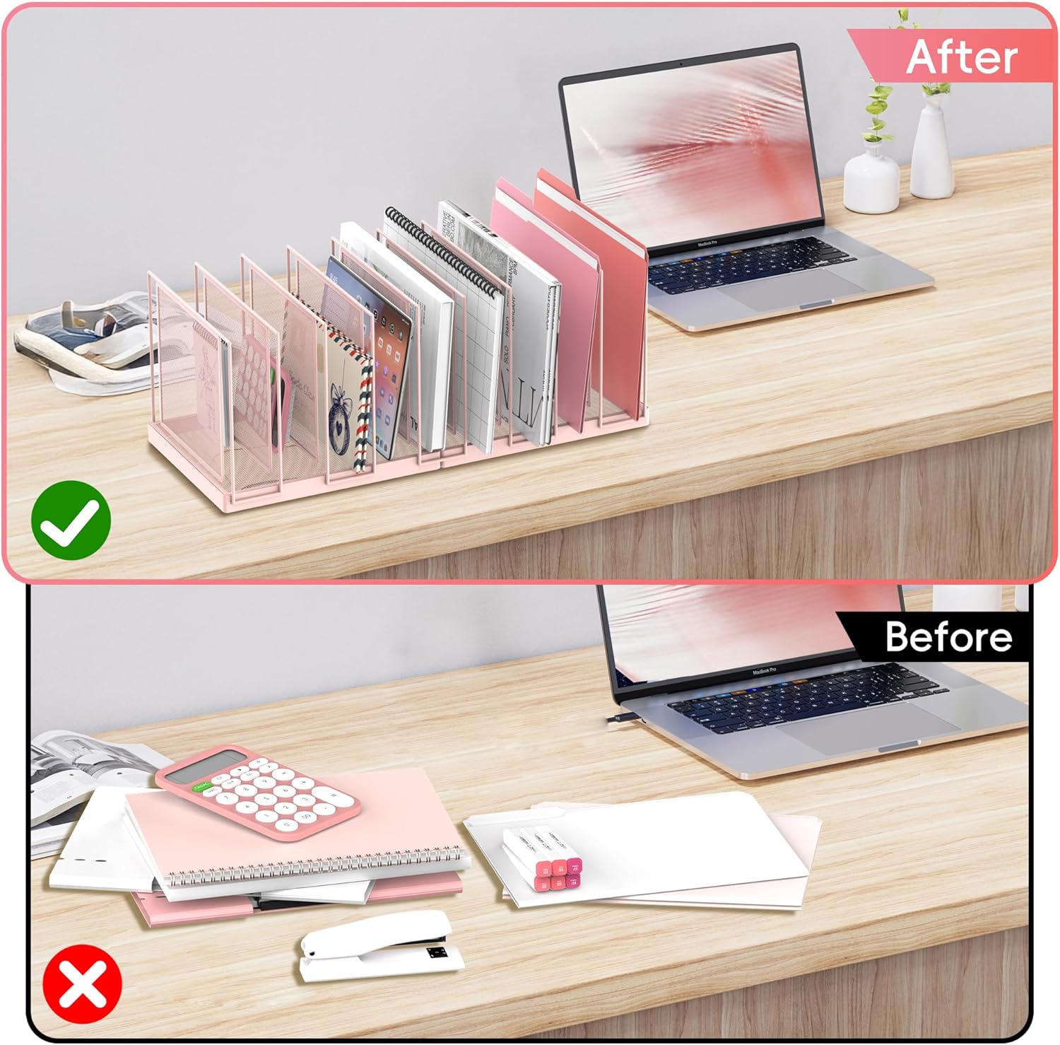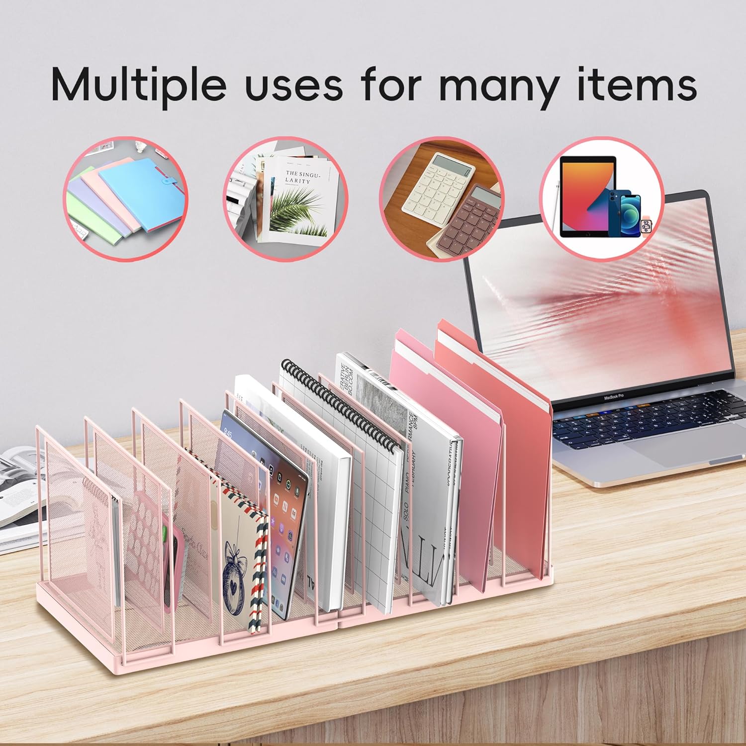 9-Section Desk File Organizer, Vertical File Holder, Mesh Desktop File Folder Metal File Organizer Stand for Office Home Classroom, Pink
