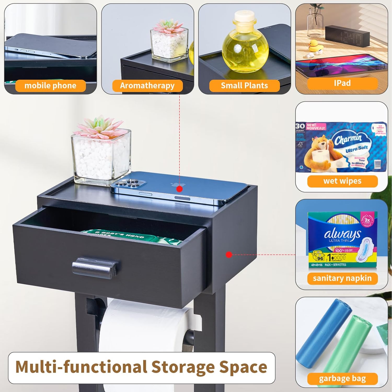 - 4-IN-1 DESIGN: This wooden freestanding toilet paper holder comes with a storage drawer at the top for cell phones and wipes. Additional toilet paper storage is also available. You can store 4 rolls of toilet paper at the same time, this toilet paper holder with shelf combines the functions of four products in one, which can meet your various needs in the bathroom