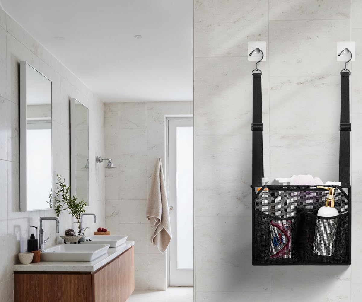 - Flexible & Versatile Hanging System: Adjustable hanging straps (adjustable from 10'' to 19'' height) with metal hooks enable easy attachment to shower rods, doorknobs, towel racks, or doors, keeping your items off floor and always at an easily accessible height.