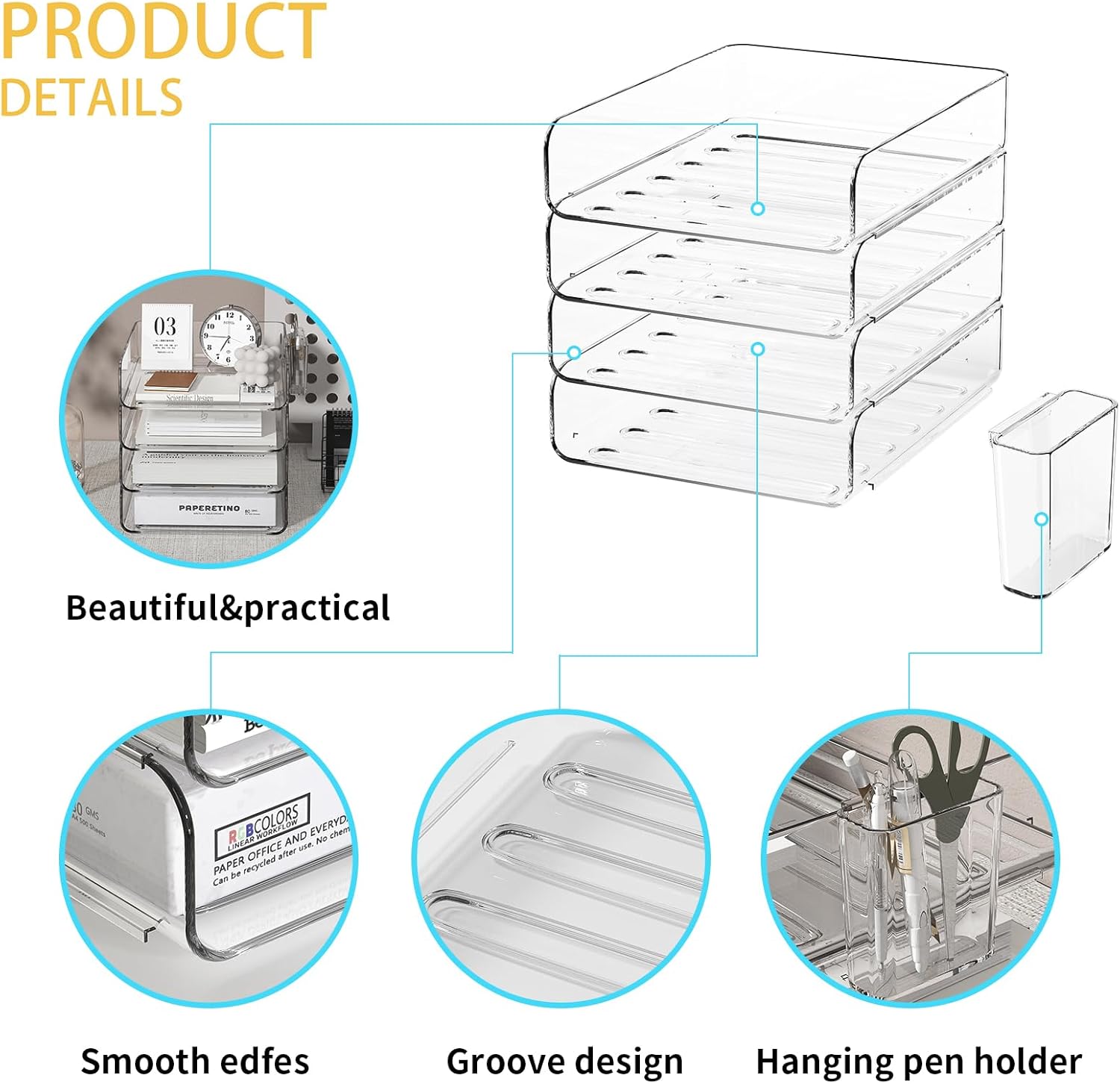 4-Tier Acrylic Paper Tray Organizer with Pen Holder | Clear Stackable Desk Organizer for Documents, Letters, A4 Paper | Modern Office/Classroom/Home Organization