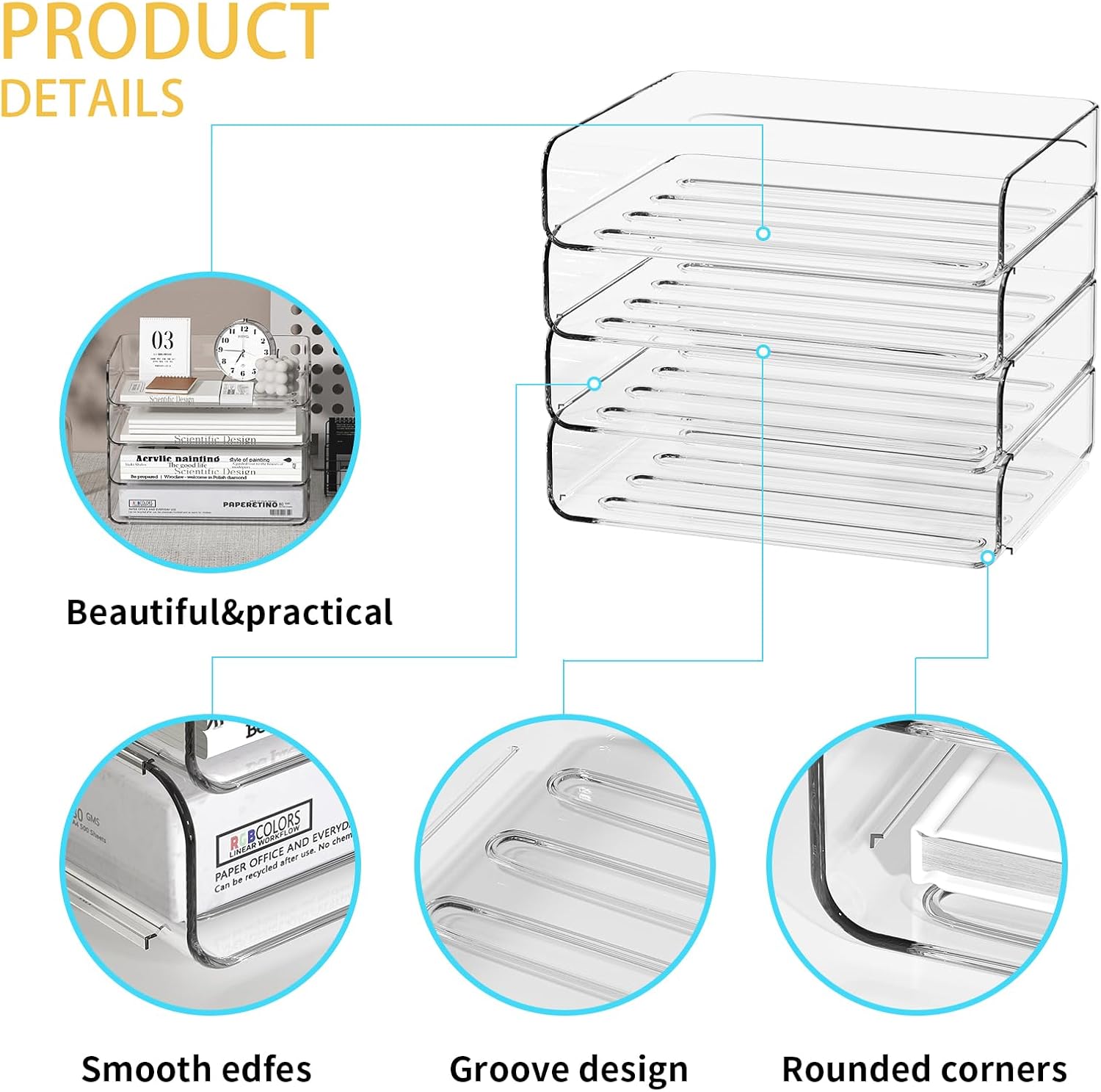 4-Tier Acrylic Paper Tray Organizer - Low-Profile Desk File Sorter for Office/Home, Clear Stackable Letter Tray for Bills, Crafts, Notebooks