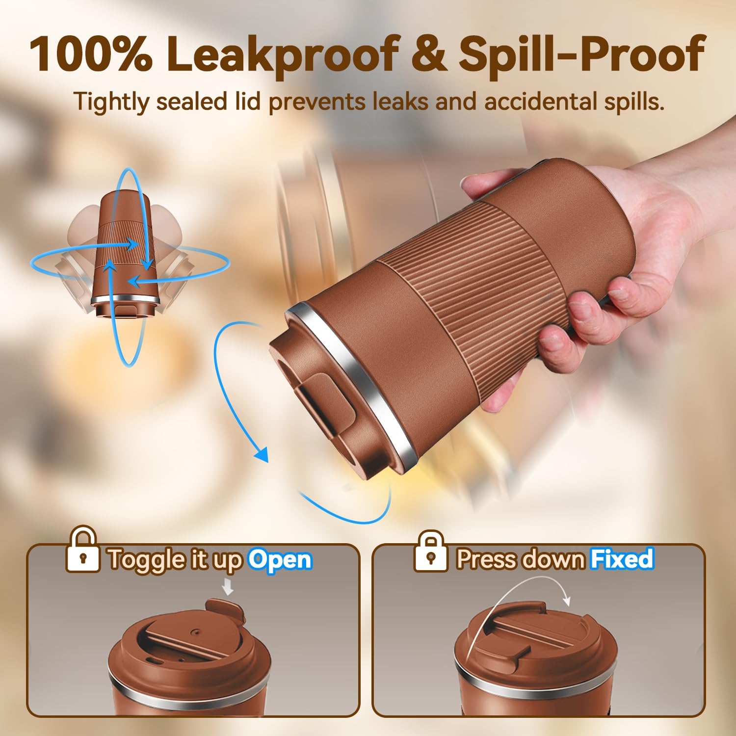 12OZ Travel Coffee Mug Insulated Coffee Cup with Spill Leak Proof Lid, Portable Stainless Steel Tumbler Reusable Hot and Cold Water Mug for Car, Daily, Camping- Coffee