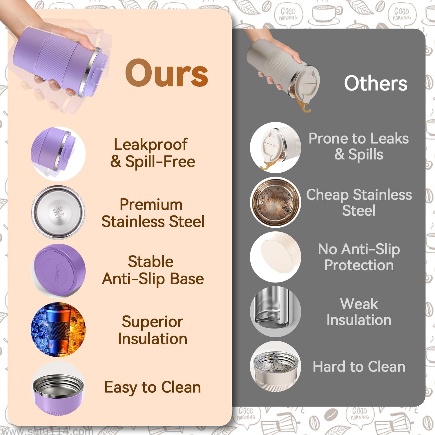 - Superior Thermal Insulation: Featuring advanced double-wall vacuum insulation, this travel mug effectively preserves the temperature of your beverage without causing heat transfer or condensation on the outer surface. Whether you're enjoying a hot brew or a cold refreshment, your drink stays enjoyable from the first sip to the last.