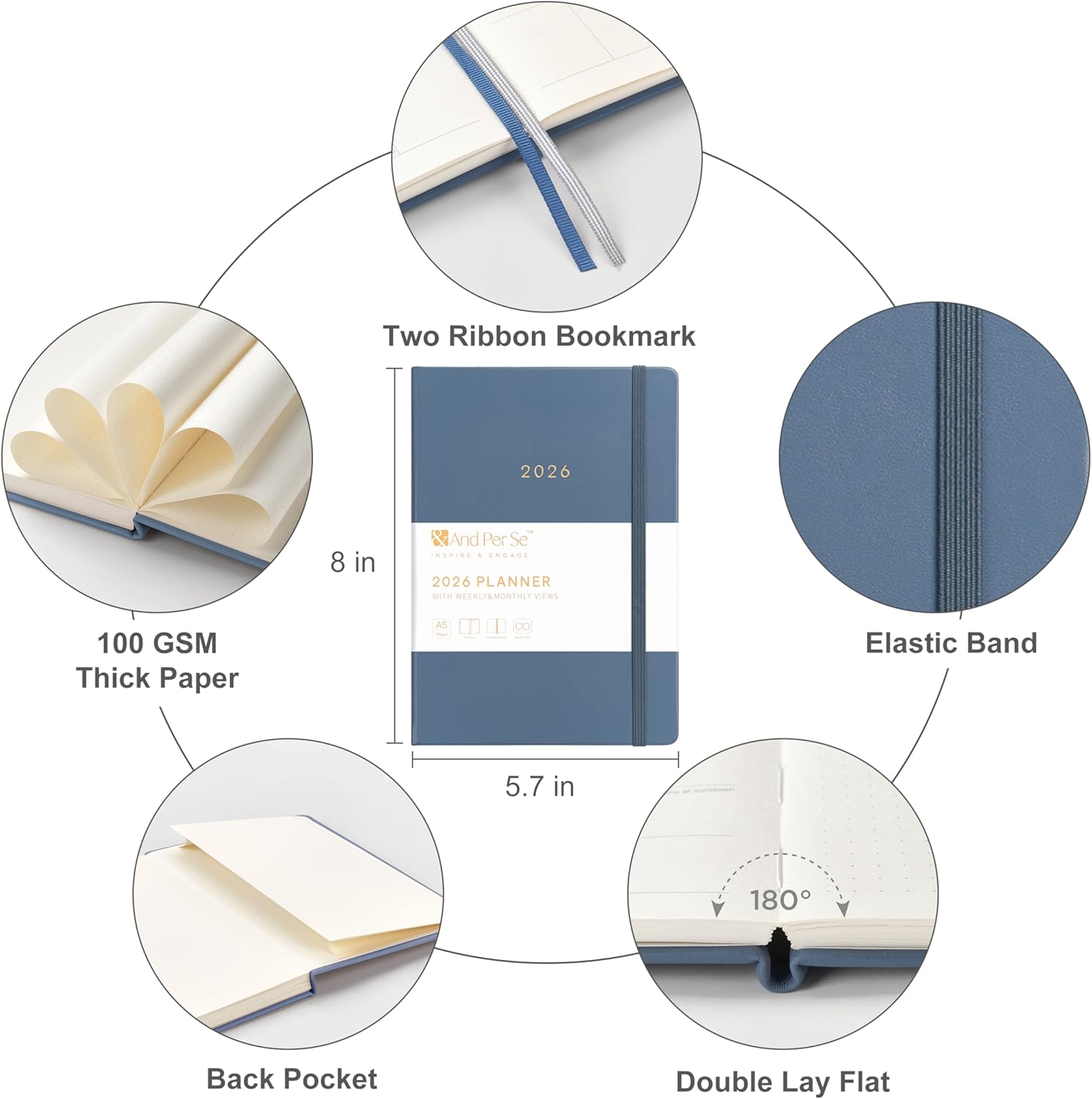 And Per Se 2026 Planner-Daily, Weekly & Monthly Leather Hardcover Planner, 5.7" x 8", Daily Schedule, Monthly Tabs, 100 GSM Thick Paper, Back Pocket(Dark Blue)