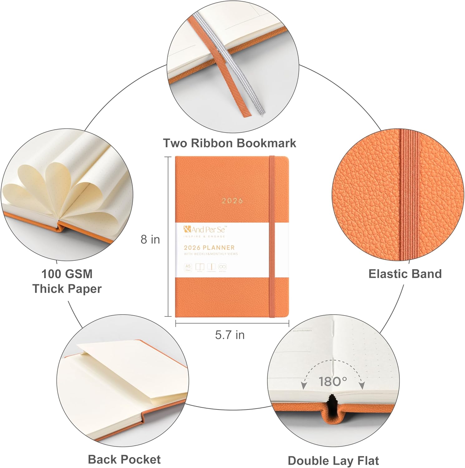 And Per Se 2026 Planner-Daily, Weekly & Monthly Leather Hardcover Planner, 5.7" x 8", Daily Schedule, Monthly Tabs, 100 GSM Thick Paper, Back Pocket(Pumpkin Orange)