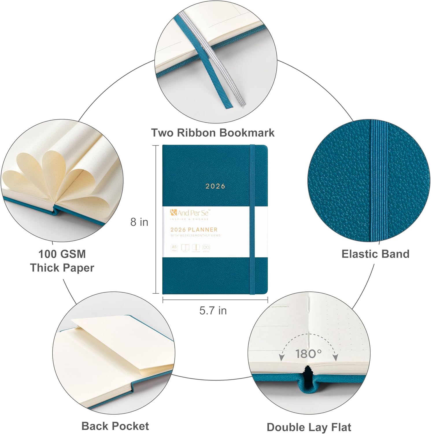 And Per Se 2026 Planner-Daily, Weekly & Monthly Leather Hardcover Planner, 5.7" x 8", Daily Schedule, Monthly Tabs, 100 GSM Thick Paper, Back Pocket(Dark Turquoise)
