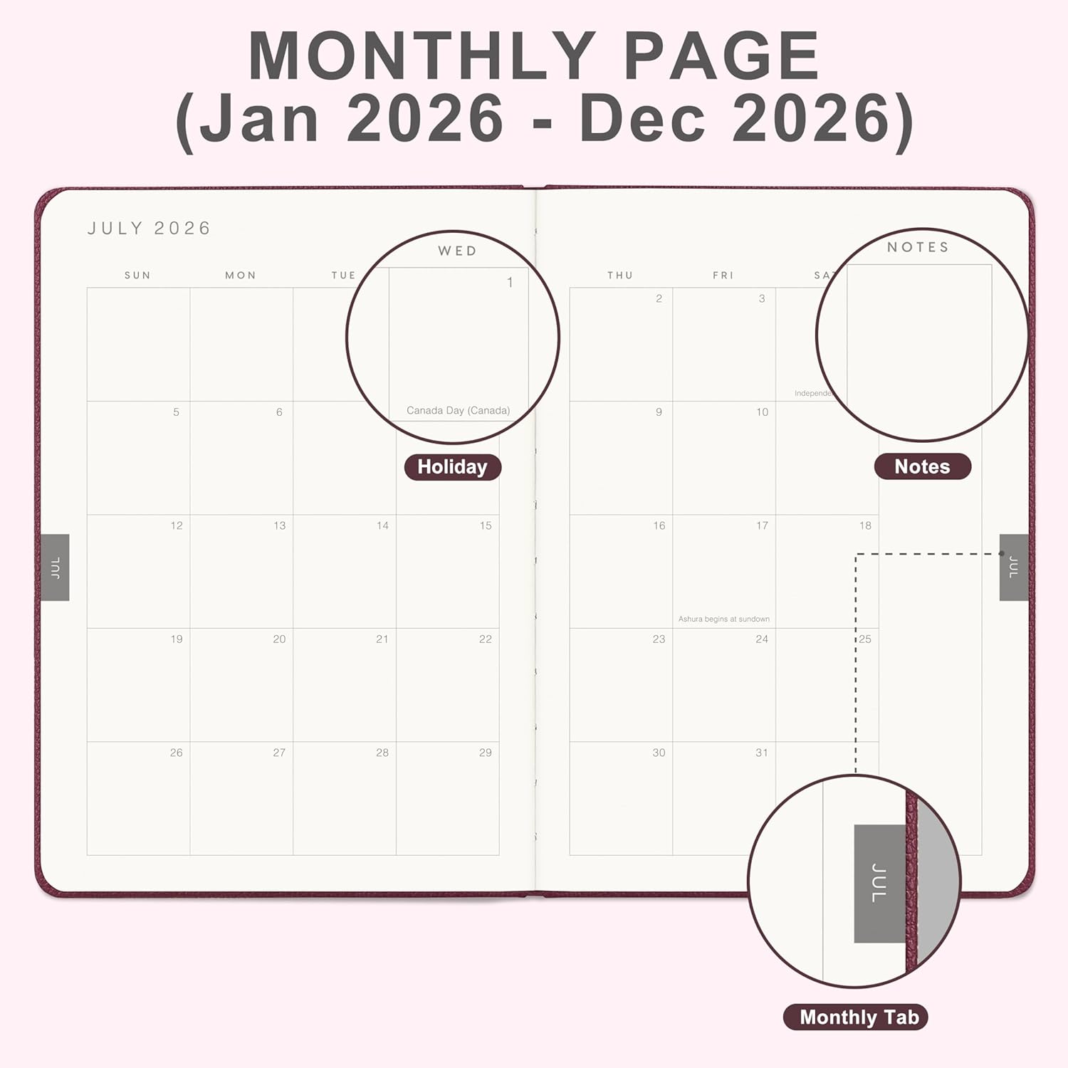 And Per Se 2026 Planner-Daily, Weekly & Monthly Leather Hardcover Planner, 5.7" x 8", Daily Schedule, Monthly Tabs, 100 GSM Thick Paper, Back Pocket(Dark Red)