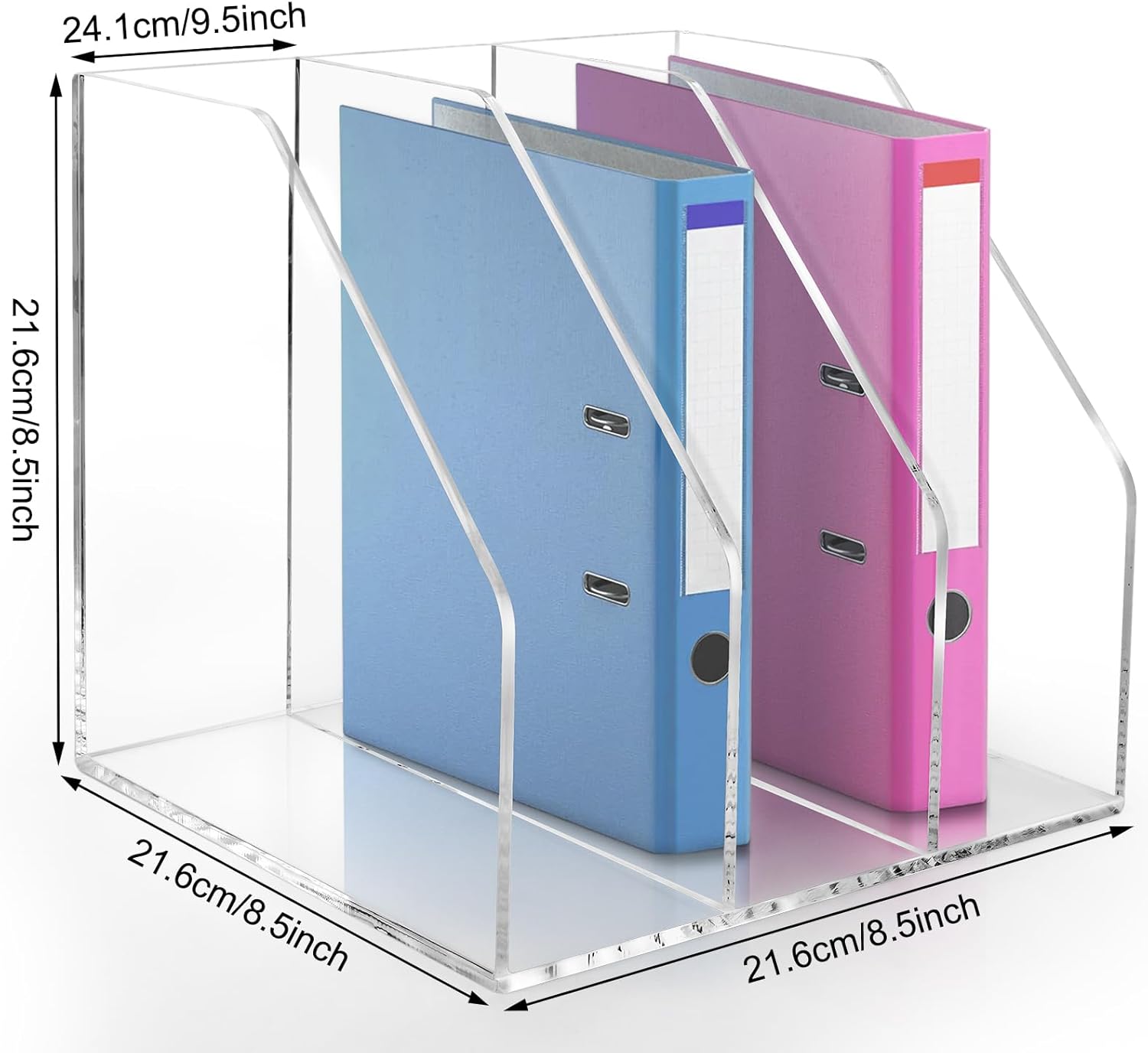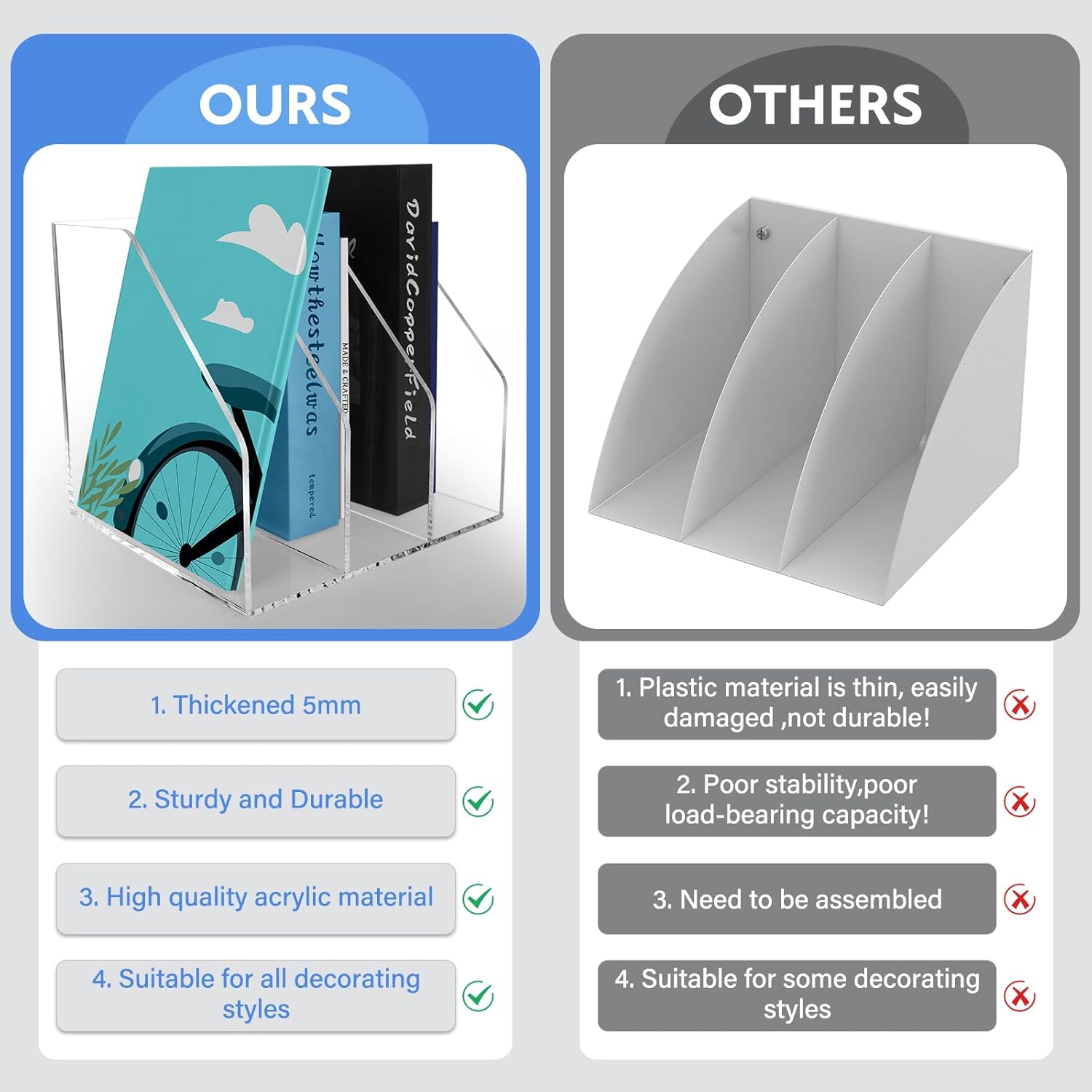 - Versatile Design: With multiple compartments, to help you organize magazine files, books. This Acrylic magazine racks make it easy to find the files you need.